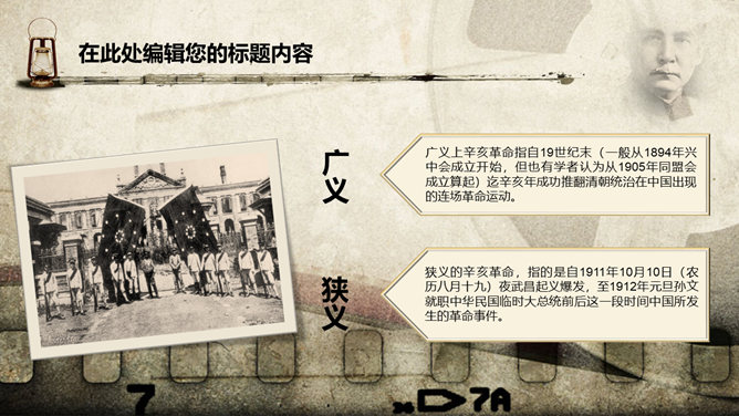 广义上辛亥革命指自19世纪末(一般从1894年兴中会成立开始,但也有学者认为从1905年同盟会成立算起)迄辛亥年成功推翻清朝统治在中国出现的连场革命运动。狭义的辛亥革命,指的是自1911年10月10日(农历八月十九)夜武昌起义爆发,至1912年元旦孙文就职中华民国临时大总统前后这一段时间中国所发生的革命事件。以清道光二十年到二十二年(1840—1842)的鸦片战争为标志,中国历史进入了近代,也就是半殖民地半封建社会时代 。鸦片战争和一系列不平等条约的订立,使中国社会发生了根本的变化。中国领土和主权的完整遭到破坏,开始丧失了政治上的独立地位。辛酉政变后,随着太平天国的失败,清廷政局逐渐稳定下来,慈禧太后的统治地位也日趋巩固 。1895年中日战争后,英、俄、美、日、法、德等国争先恐后地夺取侵华权益,迅速形成了瓜分中国的局势。1895年2月,孙中山在香港建立兴中会总部,规定誓词为驱除鞑虏,恢复中国,建立合众政府,鲜明地提出了中国资产阶级民主革命的第一个纲领。《革命军》一书的出版,对人们从资产阶级改良主义思想跃进到资产阶级革命思想,起了很大的推动作用。《革命军》与陈天华的《猛回头》、《警世钟》,成为革命志士必读的教科书。