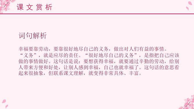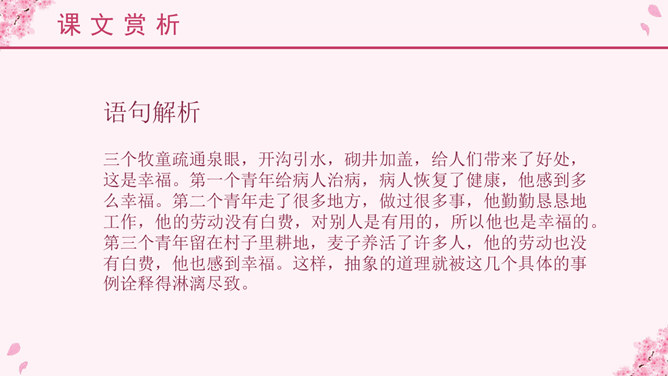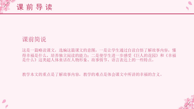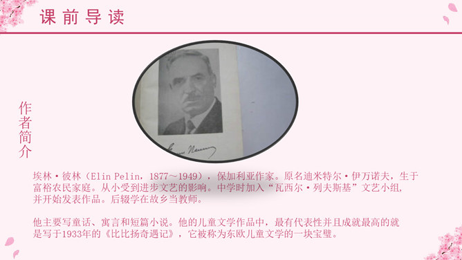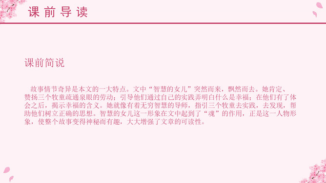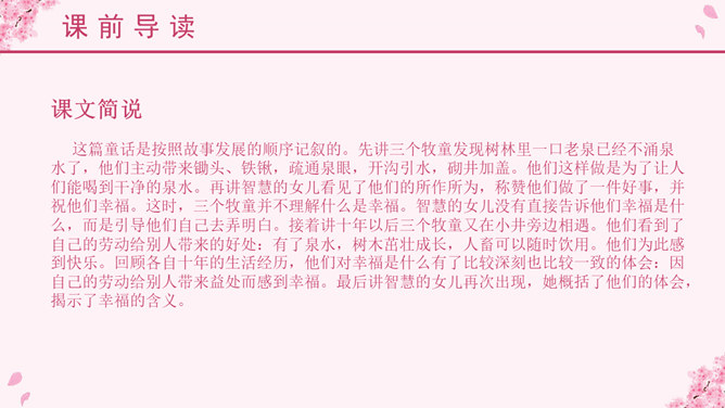埃林·彼林(Elin Pelin,1877~1949),保加利亚作家。原名迪米特尔·伊万诺夫,生于富裕农民家庭。从小受到进步文艺的影响。中学时加入“瓦西尔·列夫斯基”文艺小组,并开始发表作品。后辍学在故乡当教师。他主要写童话、寓言和短篇小说。他的儿童文学作品中,最有代表性并且成就最高的就是写于1933年的《比比扬奇遇记》,它被称为东欧儿童文学的一块宝璧。故事情节奇异是本文的一大特点。文中“智慧的女儿”突然而来,飘然而去。她肯定、赞扬三个牧童疏通泉眼的劳动;引导他们通过自己的实践弄明白什么是幸福;在他们有了体会之后,揭示幸福的含义。她就像有着无穷智慧的导师,指引三个牧童去实践,去发现,帮助他们树立正确的思想。智慧的女儿这一形象在文中起到了“魂”的作用,正是这一人物形象,使整个故事变得神秘而有趣,大大增强了文章的可读性。这是一篇略读课文,选编这篇课文的意图,一是让学生通过自读自悟了解故事内容,懂得幸福是什么,培养独立阅读的能力;二是使学生进一步感受《巨人的花园》和《幸福是什么》这类超人体童话在人物形象、故事情节、语言表达上的一些特点。教学本文的重点是了解故事内容,教学的难点是体会课文中所讲的幸福的含义。