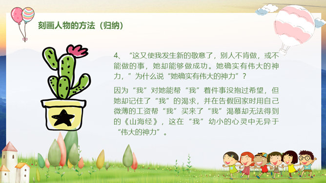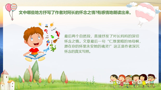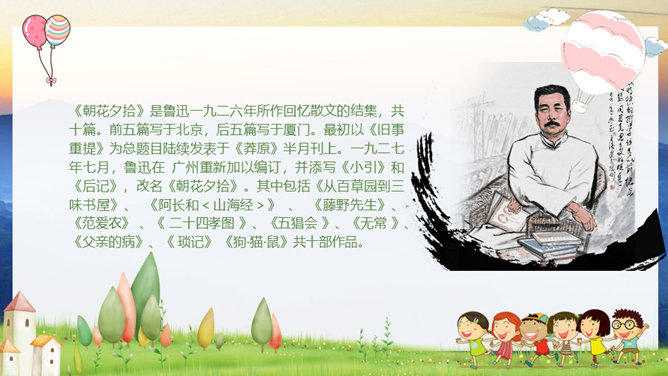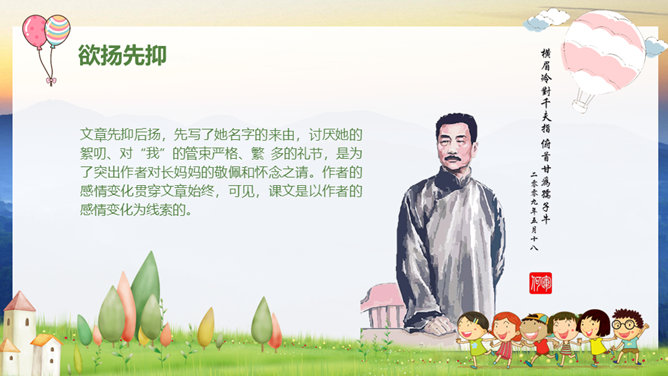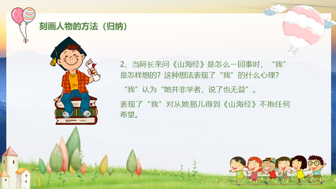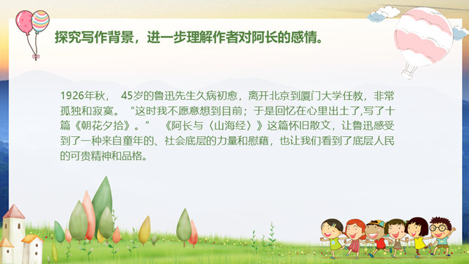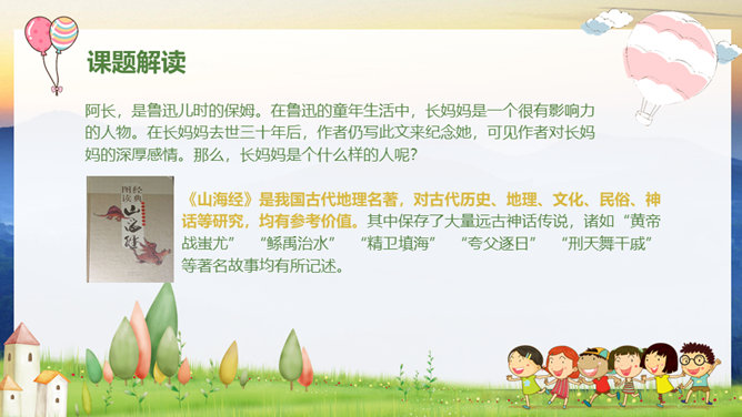 阿长,是鲁迅儿时的保姆。在鲁迅的童年生活中,长妈妈是一个很有影响力的人物。在长妈妈去世三十年后,作者仍写此文来纪念她,可见作者对长妈妈的深厚感情。那么,长妈妈是个什么样的人呢?《山海经》是我国古代地理名著,对古代历史、地理、文化、民俗、神话等研究,均有参考价值。其中保存了大量远古神话传说,诸如“黄帝战蚩尤” “鲧禹治水” “精卫填海” “夸父逐日” “刑天舞干戚”等著名故事均有所记述。阿长是一个很不幸而又热望一生平安的劳动妇女,她没有文化、粗俗、好事,而又心地善良、热心帮助孩子解决疑难。文章先抑后扬,先写了她名字的来由,讨厌她的絮叨、对“我”的管束严格、繁 多的礼节,是为了突出作者对长妈妈的敬佩和怀念之请。作者的感情变化贯穿文章始终,可见,课文是以作者的感情变化为线索的。1926年秋, 45岁的鲁迅先生久病初愈,离开北京到厦门大学任教,非常孤独和寂寞。“这时我不愿意想到目前;于是回忆在心里出土了,写了十篇《朝花夕拾》。” 《阿长与〈山海经〉》这篇怀旧散文,让鲁迅感受到了一种来自童年的、社会底层的力量和慰藉,也让我们看到了底层人民的可贵精神和品格。所属专题:阿长与山海经ppt。