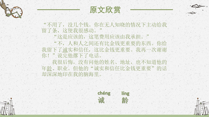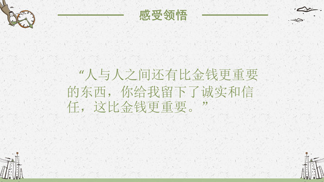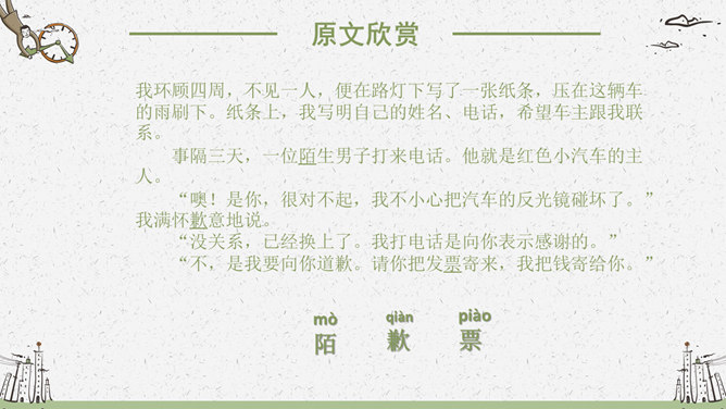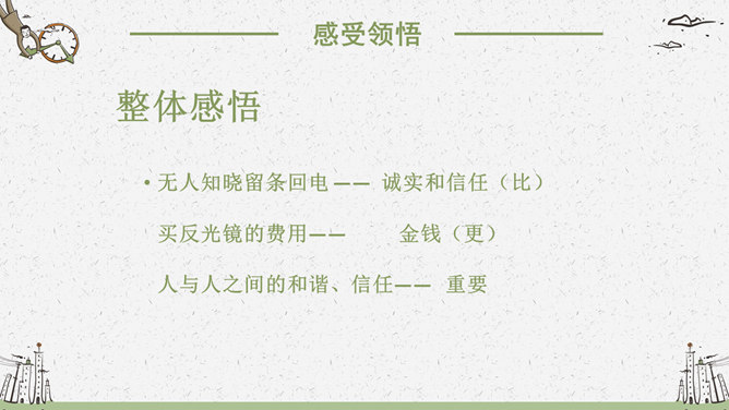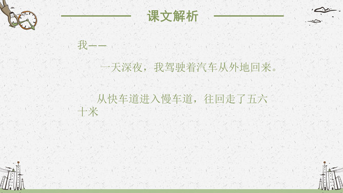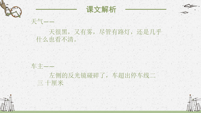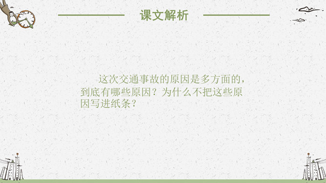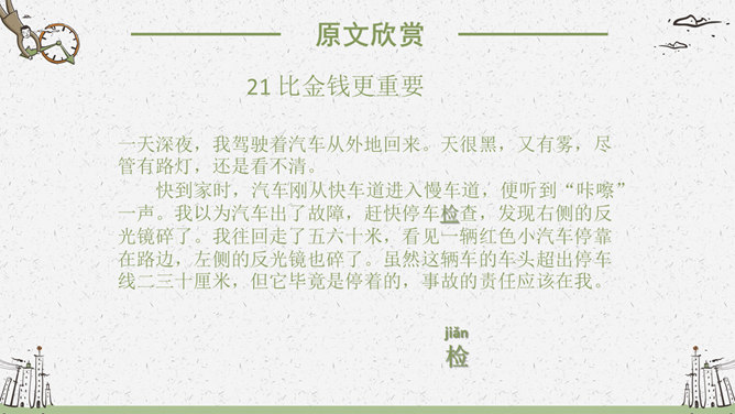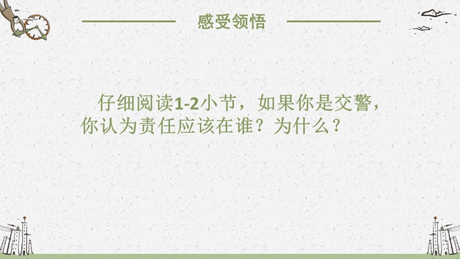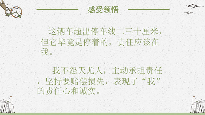 这次交通事故的原因是多方面的,到底有哪些原因?为什么不把这些原因写进纸条?天气——天很黑,又有雾,尽管有路灯,还是几乎什么也看不清。车主——左侧的反光镜碰碎了,车超出停车线二三 十厘米。我——一天深夜,我驾驶着汽车从外地回来。从快车道进入慢车道,往回走了五六十米。仔细阅读1-2小节,如果你是交警,你认为责任应该在谁?为什么?这辆车超出停车线二三十厘米,但它毕竟是停着的,责任应该在我。我不怨天尤人,主动承担责任,坚持要赔偿损失,表现了“我”的责任心和诚实。“人与人之间还有比金钱更重要的东西,你给我留下了诚实和信任,这比金钱更重要。”