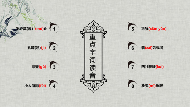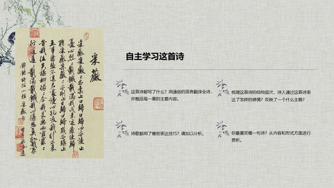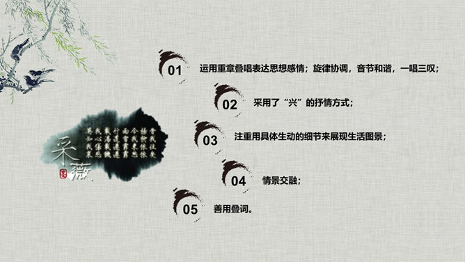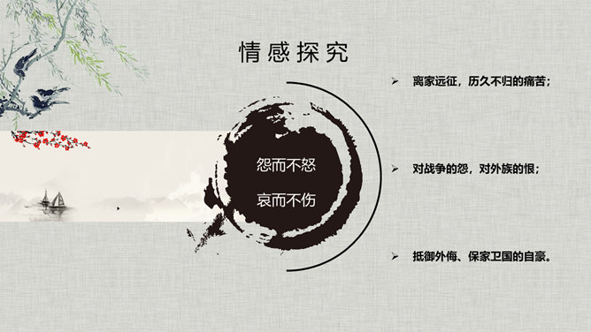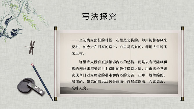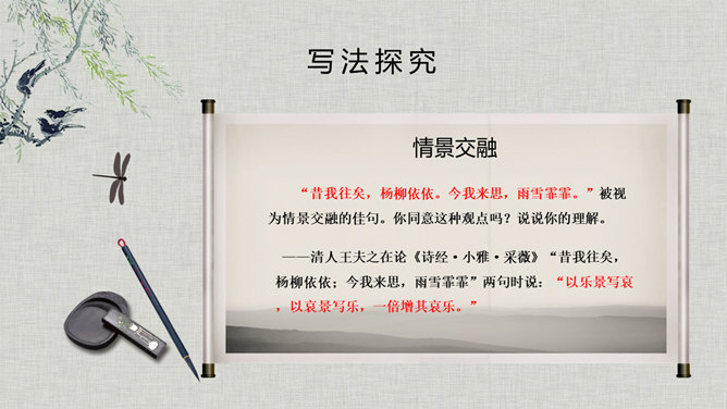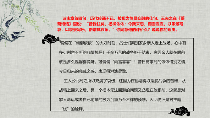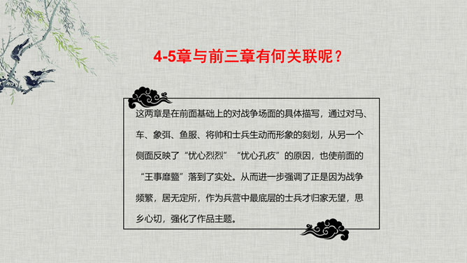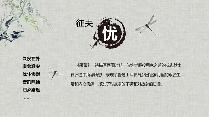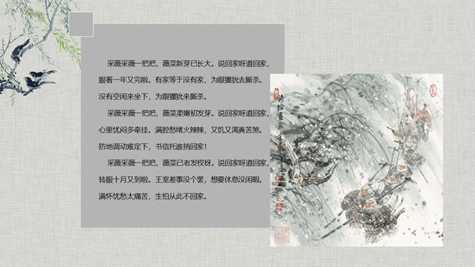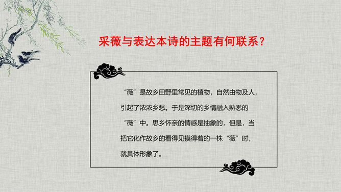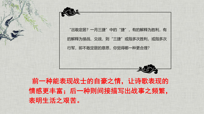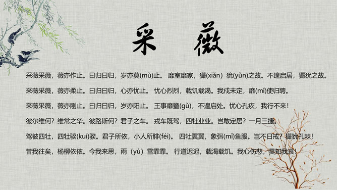采薇与表达本诗的主题有何联系?薇”是故乡田野里常见的植物,自然由物及人,引起了浓浓乡愁。于是深切的乡情融入熟悉的“薇”中。思乡怀亲的情感是抽象的,但是,当把它化作故乡的看得见摸得着的一株“薇”时,就具体形象了。4-5章与前三章有何关联呢?这两章是在前面基础上的对战争场面的具体描写,通过对马、车、象弭、鱼服、将帅和士兵生动而形象的刻划,从另一个侧面反映了“忧心烈烈”“忧心孔疚”的原因,也使前面的“王事靡盬”落到了实处。从而进一步强调了正是因为战争频繁,居无定所,作为兵营中最底层的士兵才归家无望,思乡心切,强化了作品主题。岂敢定居?一月三捷”中的“捷”,有的解释为胜利,有的解释为接战、交战,则“三捷”或指多次胜利,或指多次行军,即不敢定居的意思,你觉得哪一种更合理?前一种能表现战士的自豪之情,让诗歌表现的情感更丰富;后一种则间接描写出战事之频繁,表明生活之艰苦。所属专题:采薇ppt。