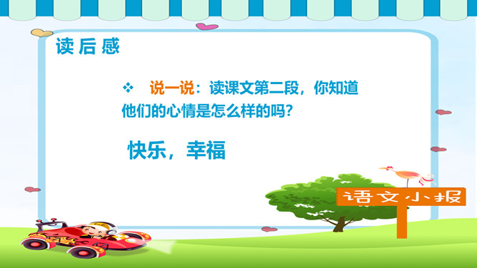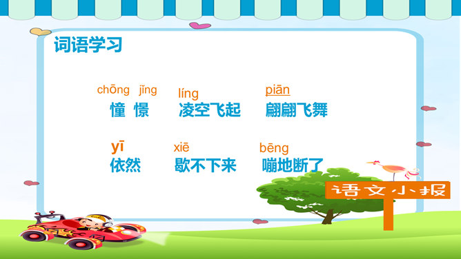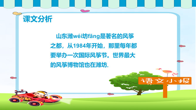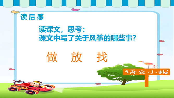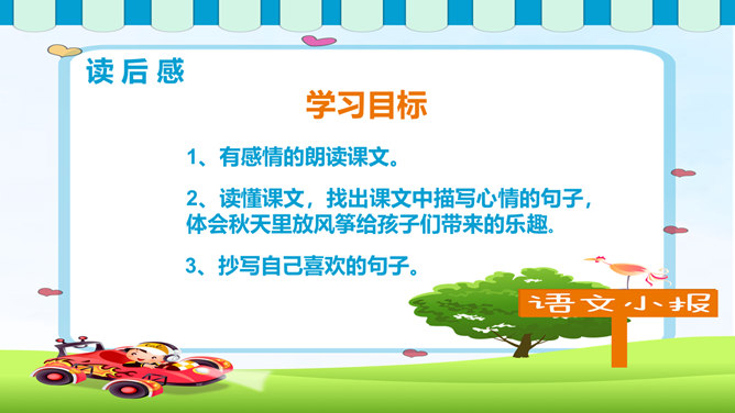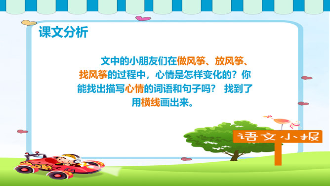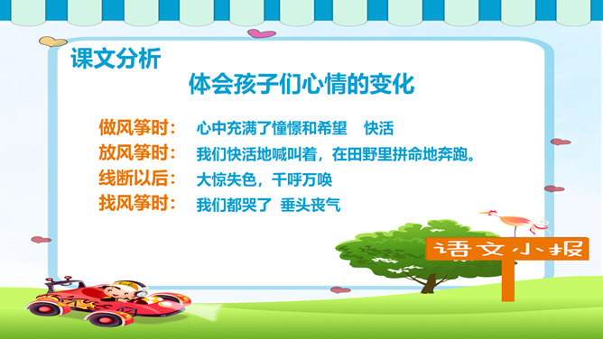 学习目标:1、有感情的朗读课文。2、读懂课文,找出课文中描写心情的句子,体会秋天里放风筝给孩子们带来的乐趣。3、抄写自己喜欢的句子。读课文,思考:课文中写了关于风筝的哪些事?说一说:读课文第二段,你知道他们的心情是怎么样的吗?找一找:哪些词句让你感受到这份快乐和幸福?默读第2自然段,划出有关句子,再和同桌交流。文中的小朋友们在做风筝、放风筝、找风筝的过程中,心情是怎样变化的?你能找出描写心情的词语和句子吗? 找到了用横线画出来。体会孩子们心情的变化,做风筝时:心中充满了憧憬和希望,快活。放风筝时:我们快活地喊叫着,在田野里拼命地奔跑。线断以后:大惊失色,千呼万唤。找风筝时:我们都哭了,垂头丧气。在中国,风筝已经有两千多年的历史了。最初的风筝是用木头做的,叫木鸢[yuān] ,后来改用纸做,叫纸鸢。在纸鸢上装上竹哨,风吹竹哨,便发出像古筝一样的声音,因此叫“风筝”。