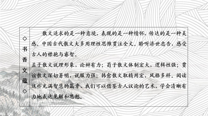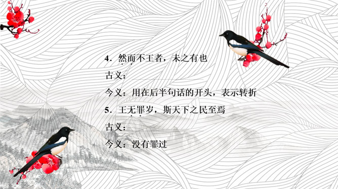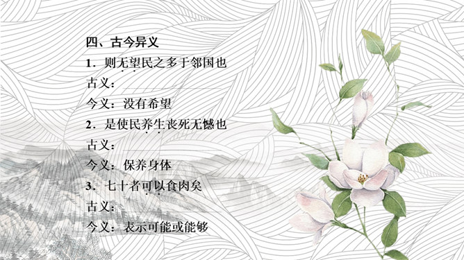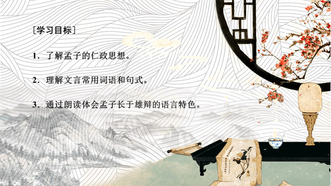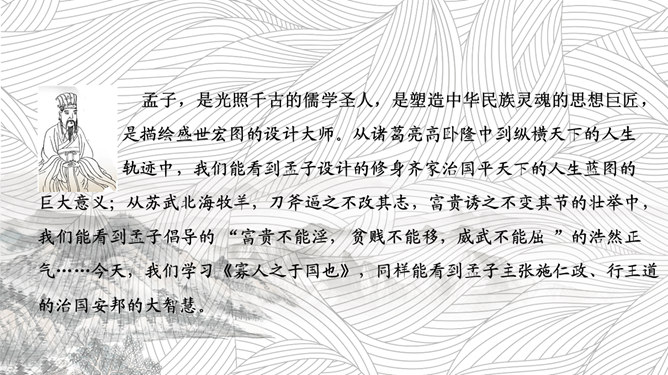 孟子,是光照千古的儒学圣人,是塑造中华民族灵魂的思想巨匠,是描绘盛世宏图的设计大师。从诸葛亮高卧隆中到纵横天下的人生轨迹中,我们能看到孟子设计的修身齐家治国平天下的人生蓝图的巨大意义;从苏武北海牧羊,刀斧逼之不改其志,富贵诱之不变其节的壮举中,我们能看到孟子倡导的“富贵不能淫,贫贱不能移,威武不能屈”的浩然正气。今天,我们学习《寡人之于国也》,同样能看到孟子主张施仁政、行王道的治国安邦的大智慧。本文通过孟子与梁惠王的一次对话,围绕“民不加多”的问题展开讨论,从而阐述了孟子的“仁政”主张:依时顺势,发展生产,使民住有房,耕有田,吃饱穿暖,受教育,懂礼仪,君王革除虐政,百姓才会来归附,民才能“加多”。