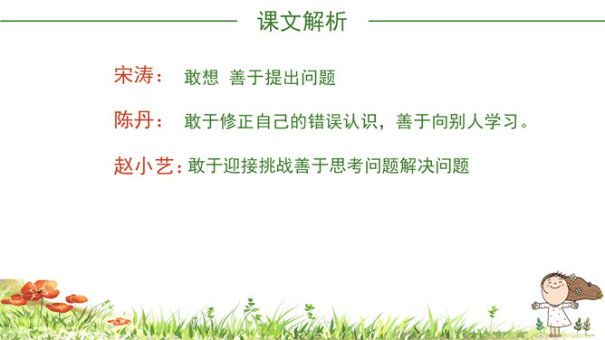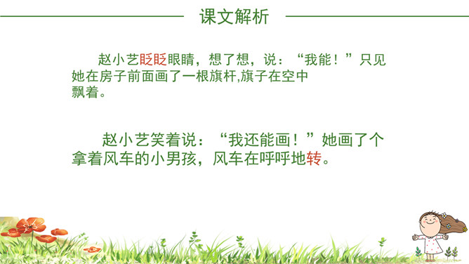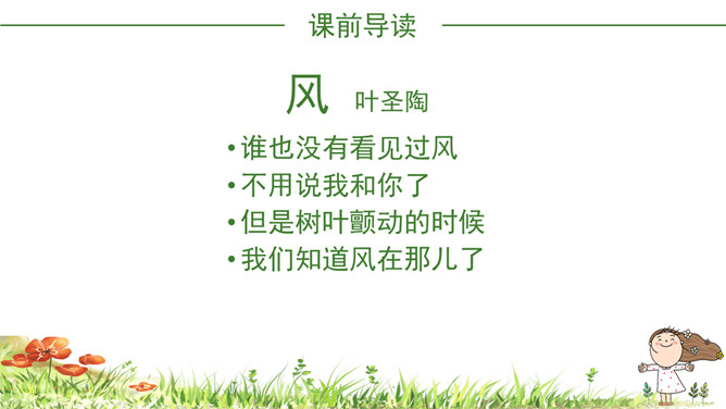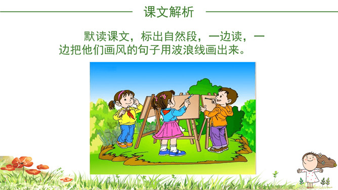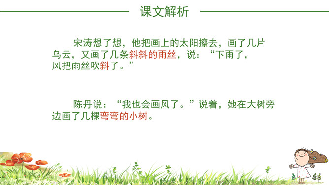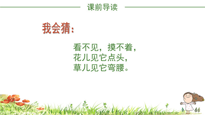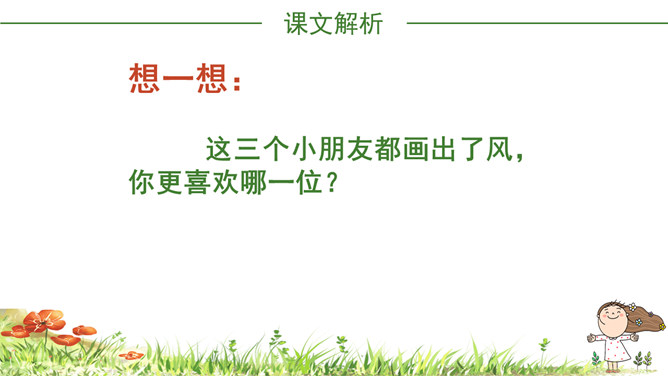 看不见,摸不着,花儿见它点头,草儿见它弯腰。默读课文,标出自然段,一边读,一边把他们画风的句子用波浪线画出来。宋涛想了想,他把画上的太阳擦去,画了几片乌云,又画了几条斜斜的雨丝,说:“下雨了,风把雨丝吹斜了。”陈丹说:“我也会画风了。”说着,她在大树旁边画了几棵弯弯的小树。想一想:这三个小朋友都画出了风,你更喜欢哪一位?宋涛:敢想,善于提出问题。陈丹:敢于修正自己的错误认识,善于向别人学习。赵小艺:敢于迎接挑战善于思考问题解决问题。三个小朋友正说着,画着,忽然吹来一阵风,画中的景物好像都在动。一张张画显得更美了。动脑筋:像风一样看不见摸不着的声音和气味,如果由你来画,你会怎样画?