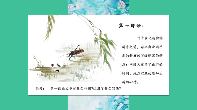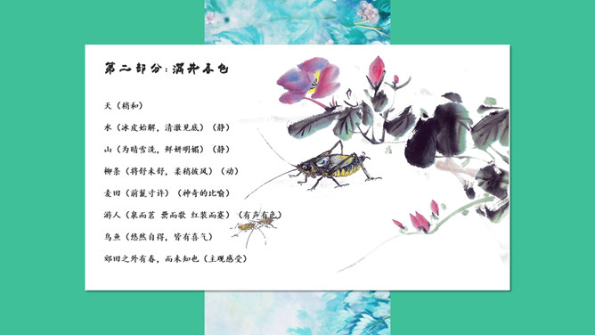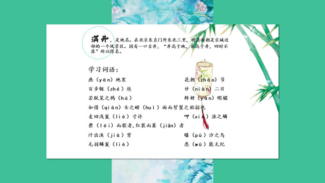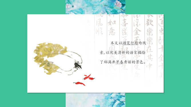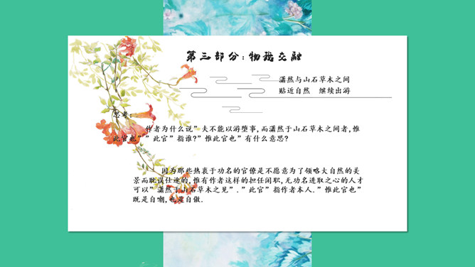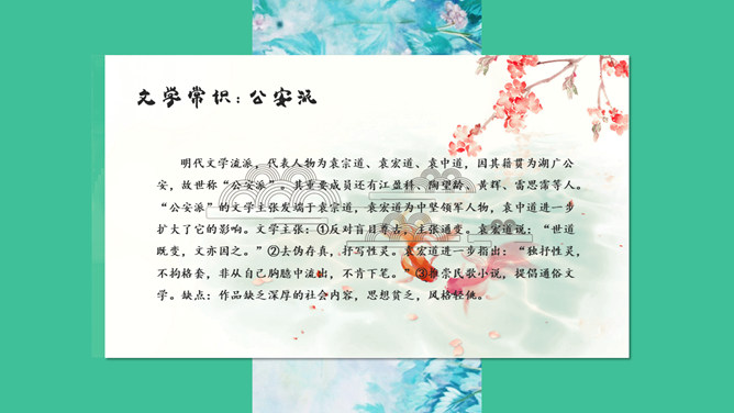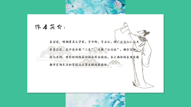 作者简介:袁宏道,明朝著名文学家。字中郎,号石公。湖广公安人。与兄弟袁宗道、袁中道并称“三袁”,又称“公安派”。鄙弃官场,淡与名利,曾长时间隐居田园和外出游历。本文曲折的表现厌倦都市官场生活和寄情山石草木的逸然情怀。文学常识:公安派,明代文学流派,代表人物为袁宗道、袁宏道、袁中道,因其籍贯为湖广公安,故世称“公安派”。其重要成员还有江盈科、陶望龄、黄辉、雷思霈等人。“公安派”的文学主张发端于袁宗道,袁宏道为中坚领军人物,袁中道进一步扩大了它的影响。文学主张:①反对盲目尊古,主张通变。袁宏道说:“世道既变,文亦因之。”②去伪存真,抒写性灵。袁宏道进一步指出:“独抒性灵,不拘格套,非从自己胸臆中流出,不肯下笔。”③推崇民歌小说,提倡通俗文学。缺点:作品缺乏深厚的社会内容,思想贫乏,风格轻佻。满井,是地名。在北京东直门外东北三里,明清两朝是京城近郊的一个风景区。因有一口古井,“井高于地,泉高于井,四时不落”所以得名。