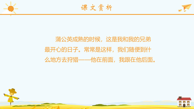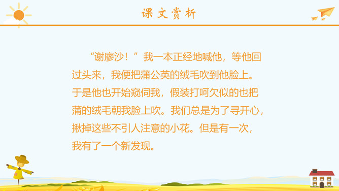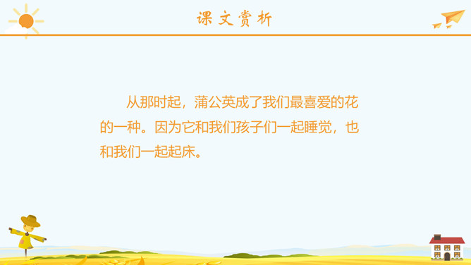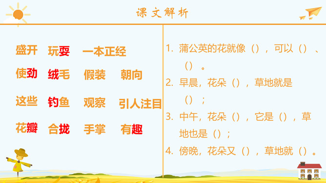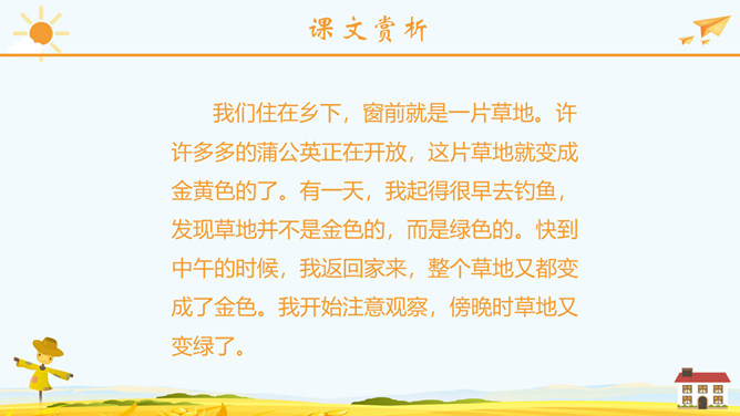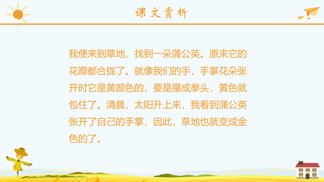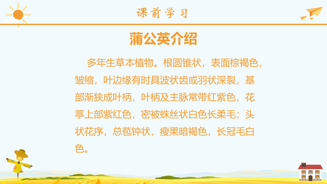 学习目标:正确流利地朗读课文。会认2个生字,会写23个生字。思考问题:1、大家喜欢郊游吗?今天老师就带你们去郊游!那在你的心目中,草地是什么样子呢?2、大家见过金色的草地吗?今天就带大家去看看那金色的草地到底是什么样子呢?3、阅读课文思考课文主要写了哪两件事情呢?蒲公英介绍:多年生草本植物。根圆锥状,表面棕褐色,皱缩,叶边缘有时具波状齿或羽状深裂,基部渐狭成叶柄,叶柄及主脉常带红紫色,花葶上部紫红色,密被蛛丝状白色长柔毛;头状花序,总苞钟状,瘦果暗褐色,长冠毛白色。一本正经:形容很规矩、很庄重的样子。使劲:用力、把力用在某件事情上。假装:故意装出某种动作或姿态,以掩盖真相。所属专题:金色的草地ppt。