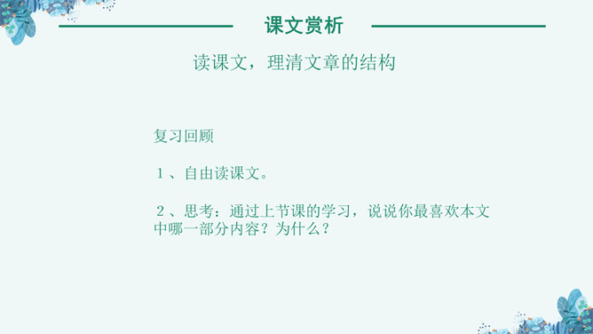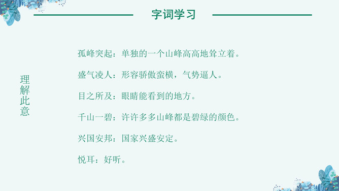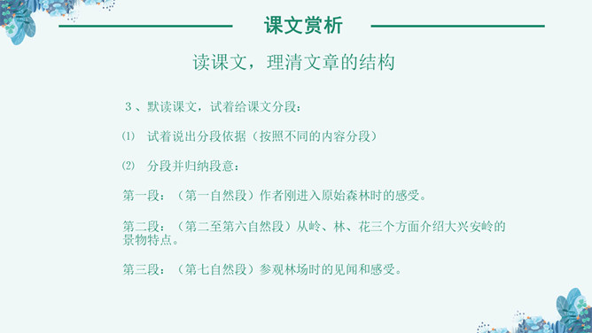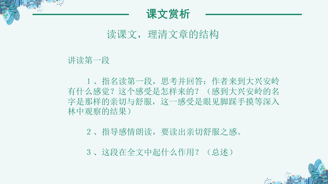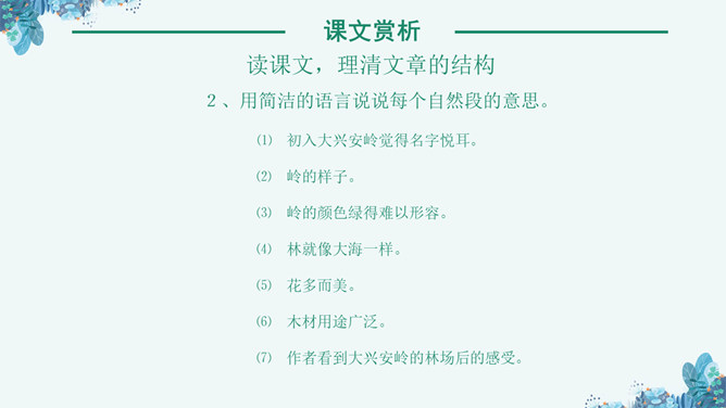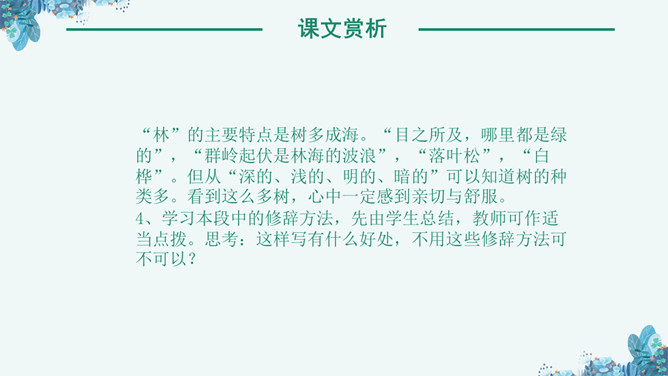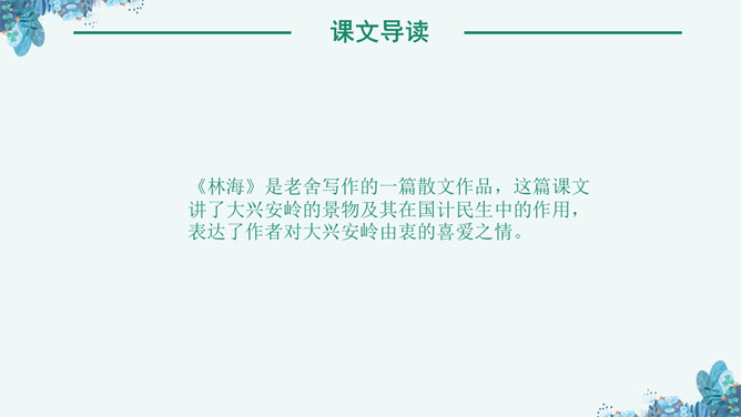 《林海》是老舍写作的一篇散文作品,这篇课文讲了大兴安岭的景物及其在国计民生中的作用,表达了作者对大兴安岭由衷的喜爱之情。孤峰突起:单独的一个山峰高高地耸立着。盛气凌人:形容骄傲蛮横,气势逼人。目之所及:眼睛能看到的地方。千山一碧:许许多多山峰都是碧绿的颜色。兴国安邦:国家兴盛安定。悦耳:好听。读课文,理清文章的结构,1、自由读课文,边读边想:每个自然段写了什么内容?2、用简洁的语言说说每个自然段的意思。⑴初入大兴安岭觉得名字悦耳。⑵岭的样子。⑶岭的颜色绿得难以形容。⑷ 林就像大海一样。⑸花多而美。⑹木材用途广泛。⑺作者看到大兴安岭的林场后的感受。“岭”的主要特点是“温柔”。“温柔”原指性情柔和,平顺。本课指山势平缓,轮廓柔和,这个特点是通过与秦岭比较得出的。“云横秦岭”意思是云在秦岭的半山腰,写出了秦岭的突兀险峻。而大兴安岭“每条岭都是那么温柔”,“谁也不孤峰突起,盛气凌人”。大兴安岭的“岭”还有一个特点是多。“在疾驰的火车上看了几个钟头,既看不完,也看不厌”。“看不厌”一是因为“岭”各具形态,二是因为“自山脚至岭顶长满了珍贵的树木”,看着这样的“岭”,心里一定感到亲切、舒服。