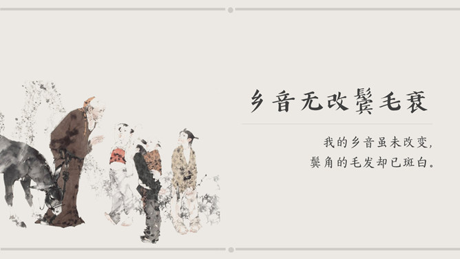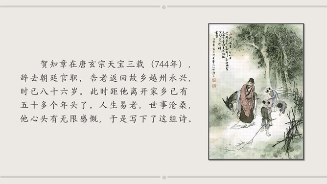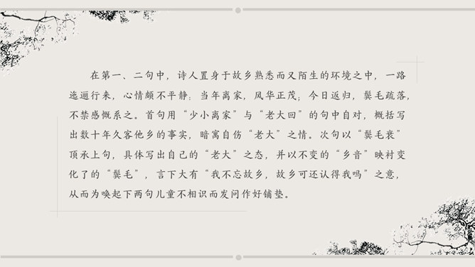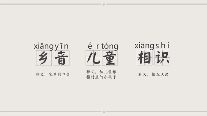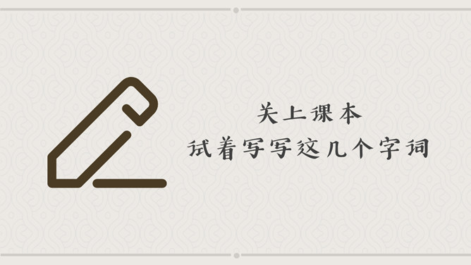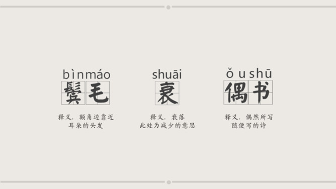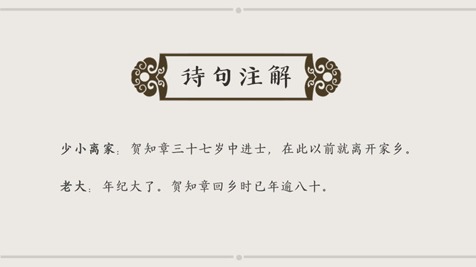 关上课本试着写写这几个字词。少小离家老大回:我年少时离开家乡,到迟暮之年才回来。少小离家:贺知章三十七岁中进士,在此以前就离开家乡。老大:年纪大了。贺知章回乡时已年逾八十。乡音无改鬓毛衰:我的乡音虽未改变,鬓角的毛发却已斑白。乡音:家乡的口音。无改:没什么变化。一作“难改”。鬓毛衰:老年人须发稀疏变少。鬓毛,额角边靠近耳朵的头发。一作“面毛”。衰,此处应是减少的意思。儿童相见不相识:家乡的儿童看见我,却没有一个认识我。相见:即看见我。相,带有指代性的副词。不相识:即不认识我。笑问客从何处来:他们笑着询问我:这客人是从哪里来的呀?笑问:笑着询问。一本作“却问”,一本作“借问”。这是一首描写久客异乡、缅怀故里的感怀诗写于初来乍到之时,抒写久客伤老之情。