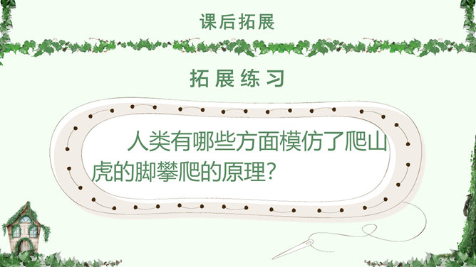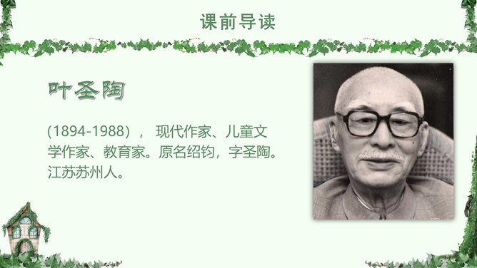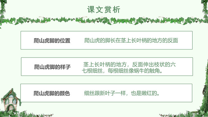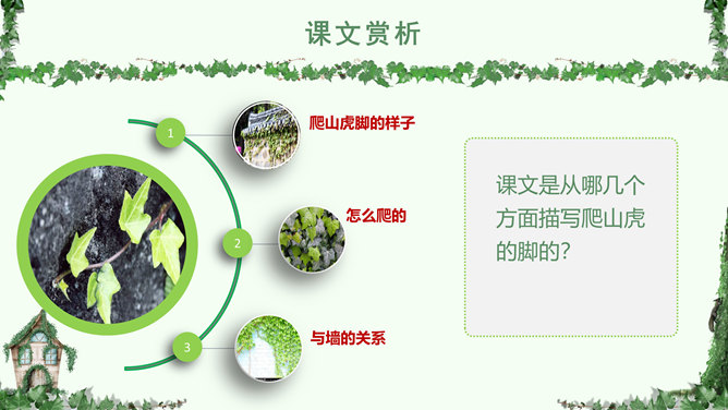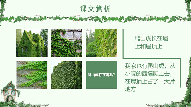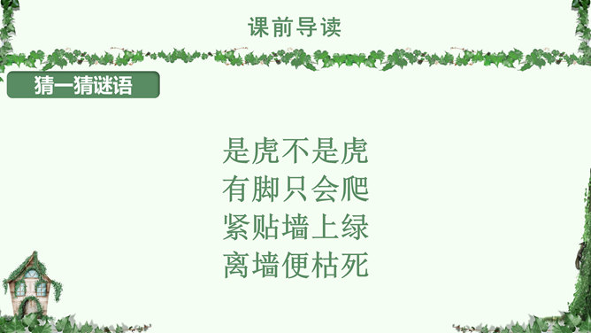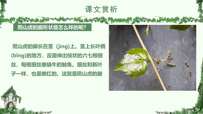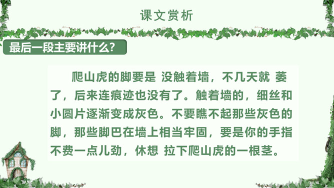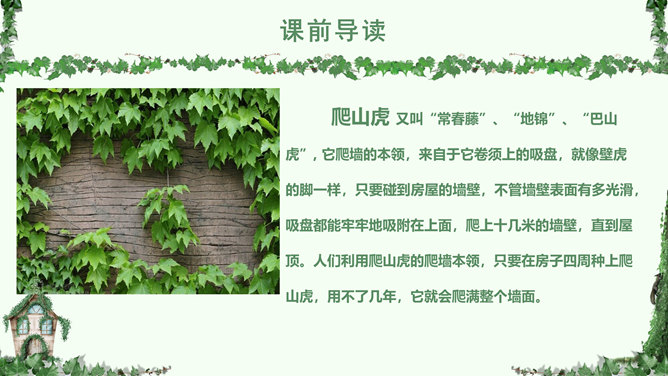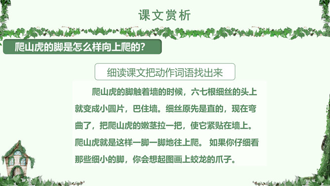 叶圣陶,(1894-1988), 现代作家、儿童文学作家、教育家。原名绍钧,字圣陶。江苏苏州人。爬山虎 又叫“常春藤”、“地锦”、“巴山虎”, 它爬墙的本领,来自于它卷须上的吸盘,就像壁虎的脚一样,只要碰到房屋的墙壁,不管墙壁表面有多光滑,吸盘都能牢牢地吸附在上面,爬上十几米的墙壁,直到屋顶。人们利用爬山虎的爬墙本领,只要在房子四周种上爬山虎,用不了几年,它就会爬满整个墙面。 读下面的句子,体会哪句话用词准确,并讲出理由。1.爬山虎就是这样一脚一脚地往上爬。2.爬山虎就是这样一步一步地往上爬。学习目标:学会本课生字词,能正确、流利、有感情的朗读课文。了解爬山虎的特点,学习作者留心观察周围事物的方法。人类有哪些方面模仿了爬山虎的脚攀爬的原理?所属专题:爬山虎的脚ppt。