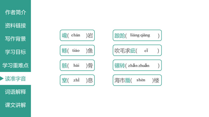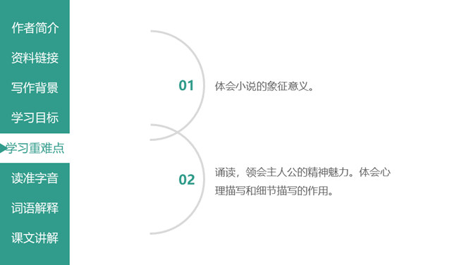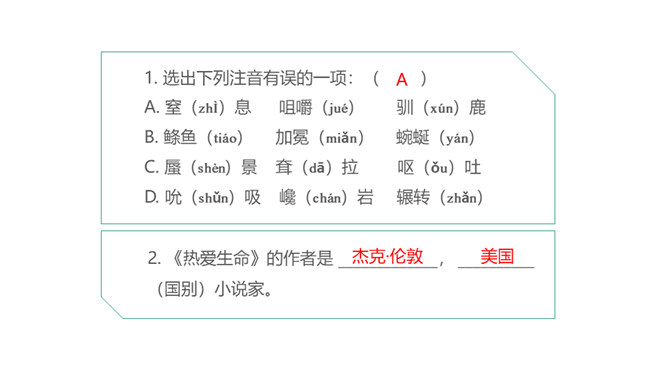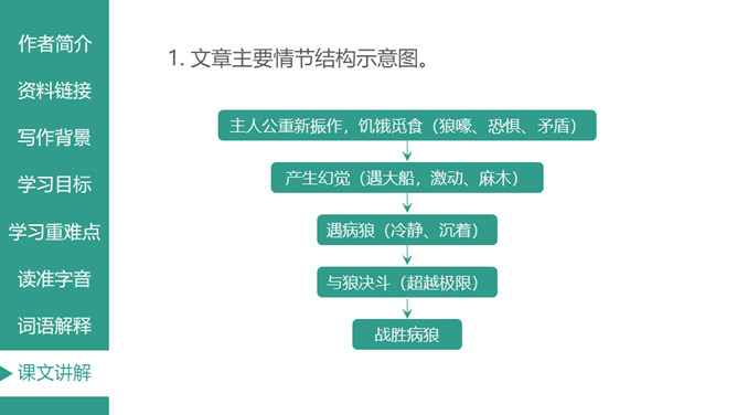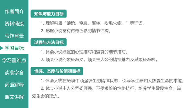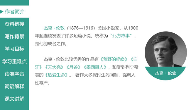 杰克 · 伦敦(1876—1916)美国小说家,从1900年起连续发表了许多短篇小说,统称为“北方故事”,是他的成名之作。杰克 · 伦敦比较优秀的作品有《荒野的呼唤》《白牙》《天大亮》《月谷》《墨西哥人》,和受到列宁赞赏的《热爱生命》。 著作大多探讨生死问题,强调人性尊严。杰克 · 伦敦当过牧童、报童、童工、工人、水手。他一边拼命干活,一边刻苦学习,广泛涉猎达尔文、斯宾塞、尼采和马克思等人的著作。他曾考进加利福尼亚大学,一年后辍学。后来受了阿拉斯加淘金热的影响,加入了淘金者的行列,却因病空手而归。此后,他埋头写作,成为“出卖脑力劳动”的职业作家。1898年杰克 · 伦敦从阿拉斯加淘金回来后,发表了一系列以“淘金”为题材的短篇小说,这些作品使他一举成名。在这些优秀作品中表现出的强烈的大自然气息,勇敢和冒险的浪漫精神,人“要活下去”的坚强意志深深地吸引着读者,使人读起来激动不已。知识与能力目标:1. 理解积累“踉跄、窒息、辗转、吹毛求疵、”等词语。 2. 把握小说富有传奇色彩的情节结构。过程与方法目标:1. 体会小说细腻的心理描写和逼真的细节描写。2. 领会小说的象征意义。领会主人公的精神魅力及其象征意味。情感、态度与价值观目标:1. 体会人物在绝境中顽强求生的精神状态,引导学生感知人热爱生命的本能。2. 体会小说主人公坚韧顽强、不畏艰险的性格特征,培养学生敬畏生命、热爱生命的理念。