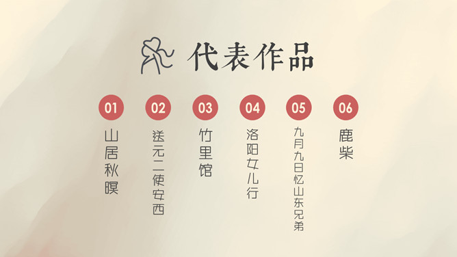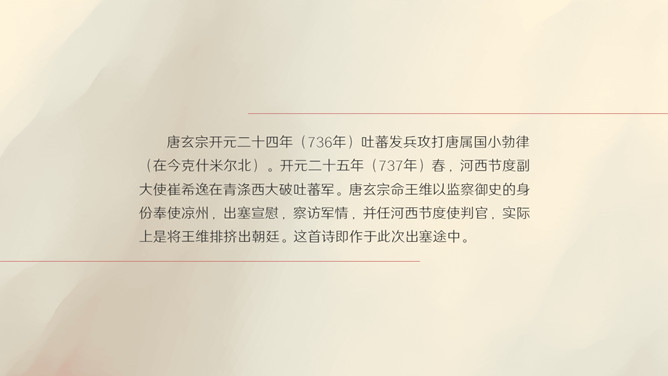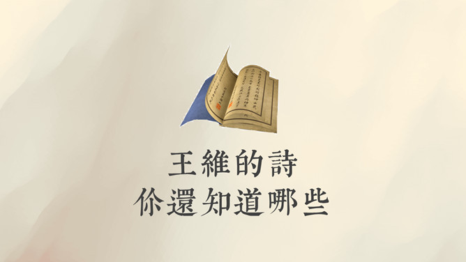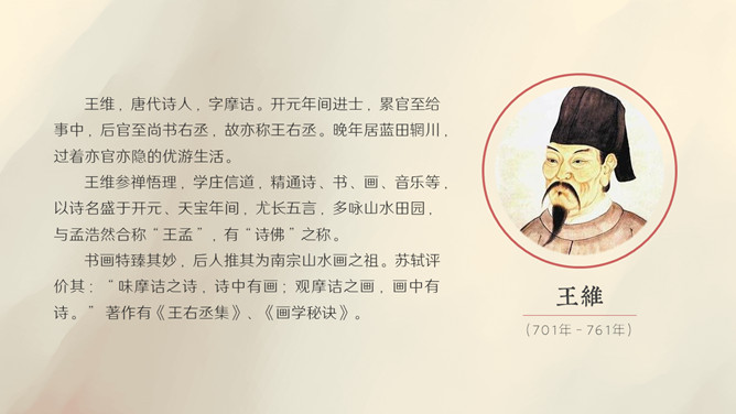 王维,唐代诗人,字摩诘。开元年间进士,累官至给事中,后官至尚书右丞,故亦称王右丞。晚年居蓝田辋川,过着亦官亦隐的优游生活。王维参禅悟理,学庄信道,精通诗、书、画、音乐等,以诗名盛于开元、天宝年间,尤长五言,多咏山水田园,与孟浩然合称“王孟”,有“诗佛”之称。书画特臻其妙,后人推其为南宗山水画之祖。苏轼评价其:“味摩诘之诗,诗中有画;观摩诘之画,画中有诗。” 著作有《王右丞集》、《画学秘诀》。李白是天才,杜甫是地才,王维是人才。王维的诗你还知道哪些?《使至塞上》是唐代诗人王维奉命赴边疆慰问将士途中所作的一首纪行诗,记述出使塞上的旅程以及旅程中所见的塞外风光。首联两句交待此行目的和到达地点,诗缘何而作;颔联两句包含多重意蕴,借蓬草自况,写飘零之感;颈联两句描绘了边陲大漠中壮阔雄奇的景象,境界阔大,气象雄浑;尾联两句虚写战争已取得胜利,流露出对都护的赞叹。所属专题:使至塞上ppt。