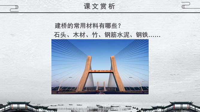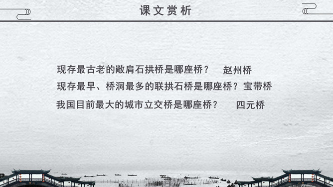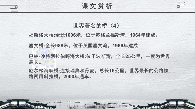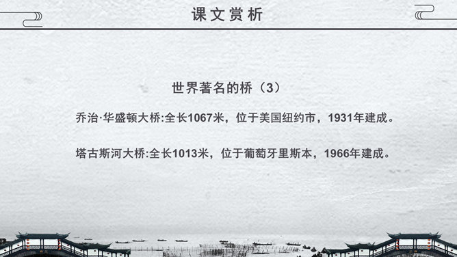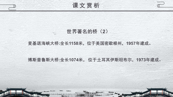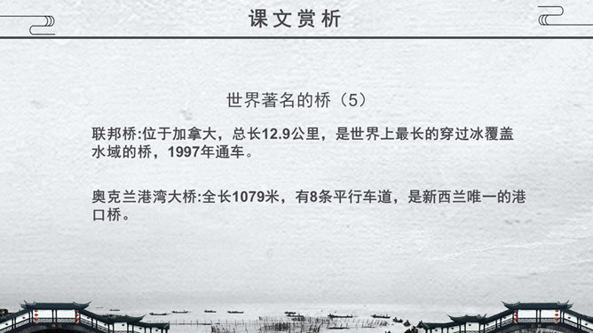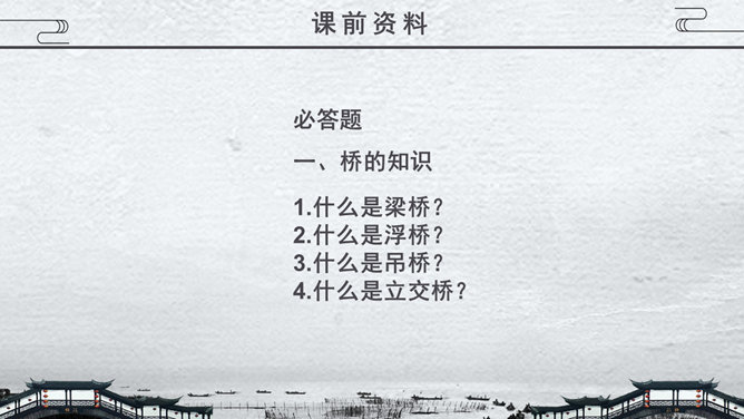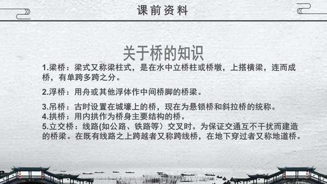 关于桥的知识,1.梁桥:梁式又称梁柱式,是在水中立桥柱或桥墩,上搭横梁,连而成桥,有单跨多跨之分。2.浮桥:用舟或其他浮体作中间桥脚的桥梁。3.吊桥:古时设置在城壕上的桥,现在为悬锁桥和斜拉桥的统称。4.拱桥:用内拱作为桥身主要结构的桥。5.立交桥:线路(如公路、铁路等)交叉时。为保证交通互不干扰而建造的桥梁。在既有线路之上跨越者又称跨线桥,在地下穿过者又称地道桥。桥从功用的角度主要分为几类?公路桥、铁路桥、公路两用桥、立交桥……建桥的常用材料有哪些?石头、木材、竹、钢筋水泥、钢铁……现存最古老的敞肩石拱桥是哪座桥?赵州桥。现存最早、桥洞最多的联拱石桥是哪座桥?宝带桥。我国目前最大的城市立交桥是哪座桥?四元桥。世界著名的桥,明石海峡大桥:全长1780米,连接日本的本洲与四国1997年建成。享伯湾大桥:全长1410米,位于英国享伯湾,1980年建成。韦拉扎诺海峡大桥:全长1298米,位于美国纽约,1964年建成。麦基诺海峡大桥:全长1158米,位于美国密歇根州,1957年建成。博斯普鲁斯大桥:全长1074米, 位于土耳其伊斯坦布尔,1973年建成。