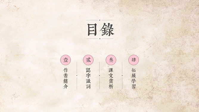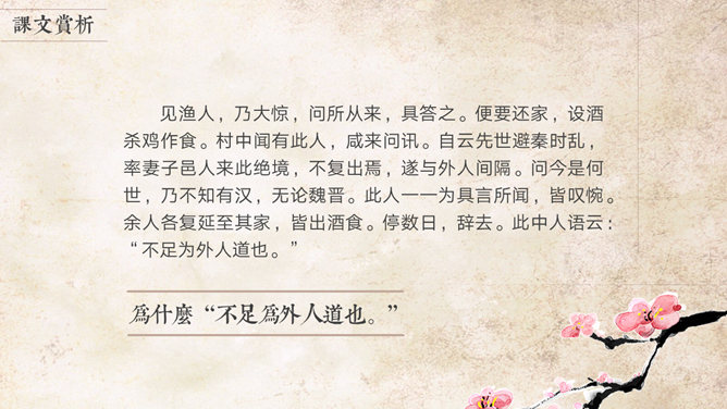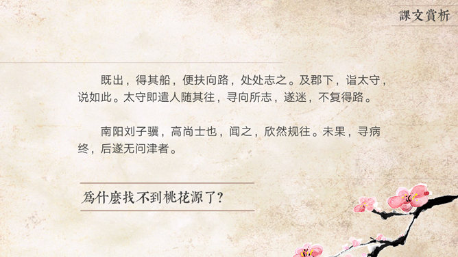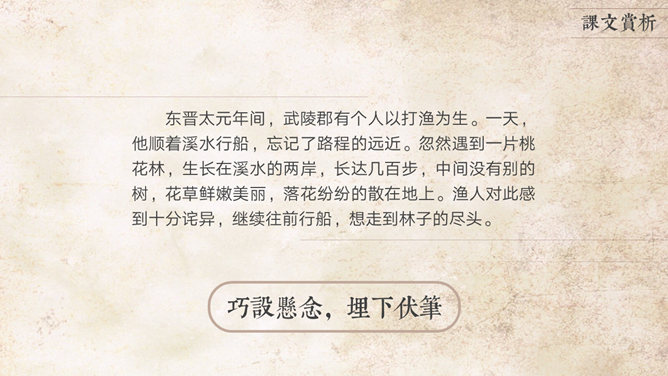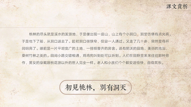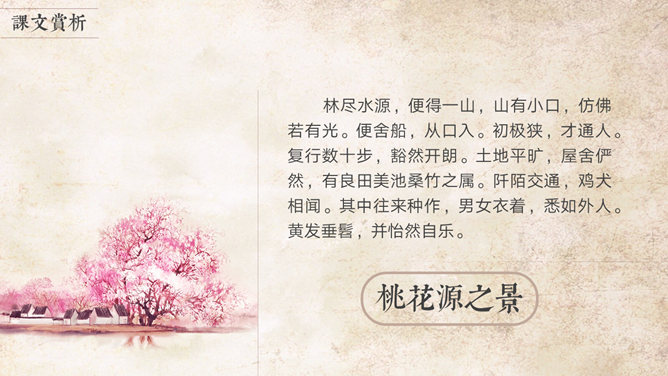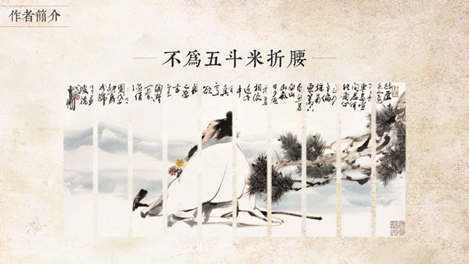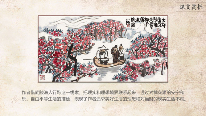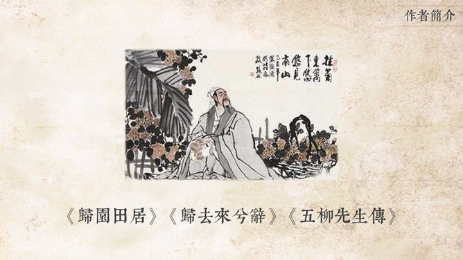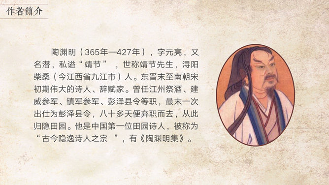 作者简介:陶渊明(365年—427年),字元亮,又名潜,私谥“靖节” ,世称靖节先生,浔阳柴桑(今江西省九江市)人。东晋末至南朝宋初期伟大的诗人、辞赋家。曾任江州祭酒、建威参军、镇军参军、彭泽县令等职,最末一次出仕为彭泽县令,八十多天便弃职而去,从此归隐田园。他是中国第一位田园诗人,被称为“古今隐逸诗人之宗 ”,有《陶渊明集》。作品有《归园田居》《归去来兮辞》《五柳先生传》。你还知道哪些表现乌托邦世界的文学作品?阅读《桃花源诗》,和《桃花源记》做对比。作者借武陵渔人行踪这一线索,把现实和理想境界联系起来,通过对桃花源的安宁和乐、自由平等生活的描绘,表现了作者追求美好生活的理想和对当时的现实生活不满。所属专题:桃花源记ppt。