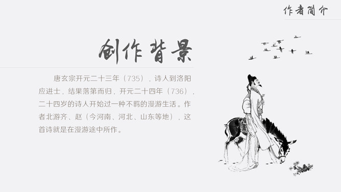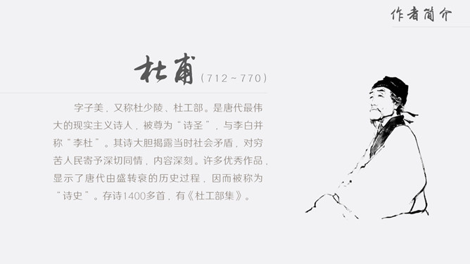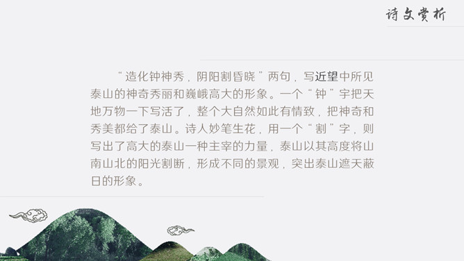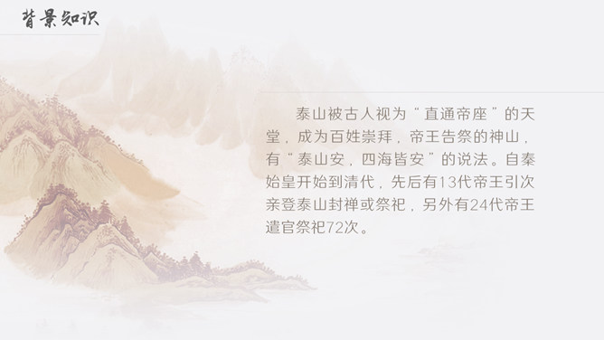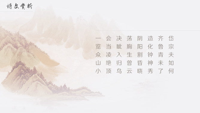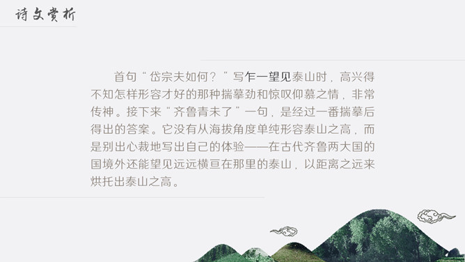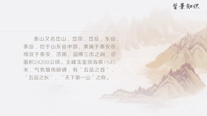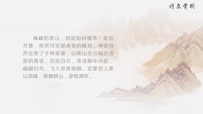 泰山又名岱山、岱宗、岱岳、东岳、泰岳,位于山东省中部,隶属于泰安市,绵亘于泰安、济南、淄博三市之间,总面积24200公顷。主峰玉皇顶海拔1545米,气势雄伟磅礴,有“五岳之首”、“五岳之长”、“天下第一山”之称。泰山被古人视为“直通帝座”的天堂,成为百姓崇拜,帝王告祭的神山,有“泰山安,四海皆安”的说法。自秦始皇开始到清代,先后有13代帝王引次亲登泰山封禅或祭祀,另外有24代帝王遣官祭祀72次。杜甫,(712~770),字子美,又称杜少陵、杜工部。是唐代最伟大的现实主义诗人,被尊为“诗圣”,与李白并称“李杜”。其诗大胆揭露当时社会矛盾,对穷苦人民寄予深切同情,内容深刻。许多优秀作品,显示了唐代由盛转衰的历史过程,因而被称为“诗史”。存诗1400多首,有《杜工部集》。创作背景:唐玄宗开元二十三年(735),诗人到洛阳应进士,结果落第而归,开元二十四年(736),二十四岁的诗人开始过一种不羁的漫游生活。作者北游齐、赵(今河南、河北、山东等地),这首诗就是在漫游途中所作。所属专题:望岳ppt。