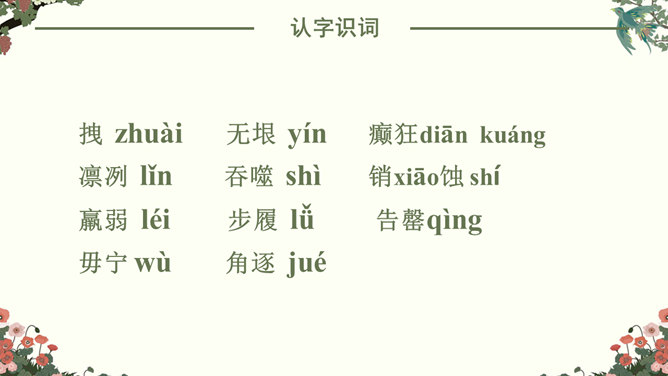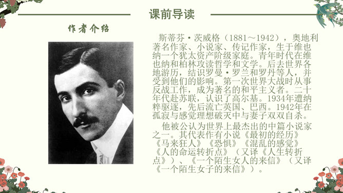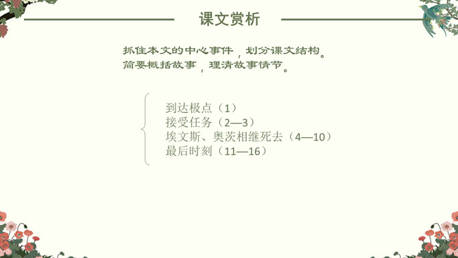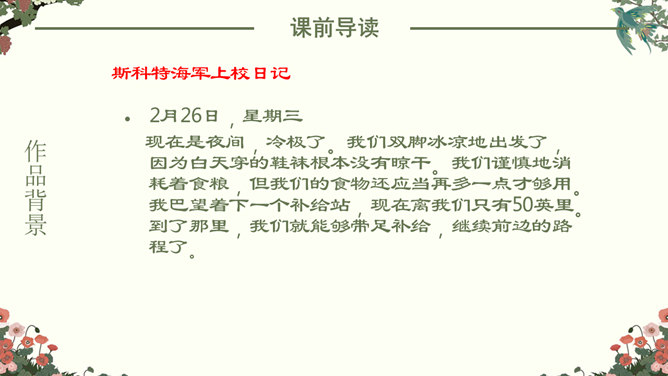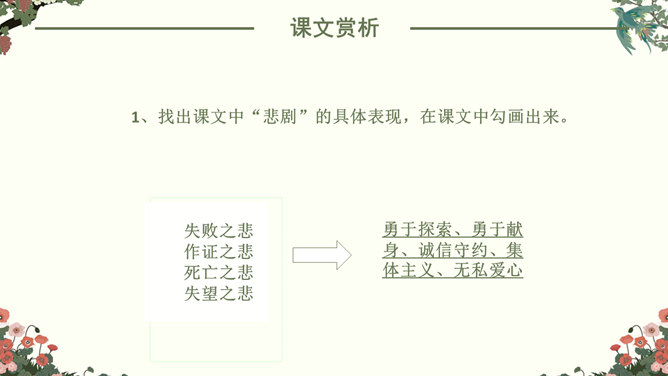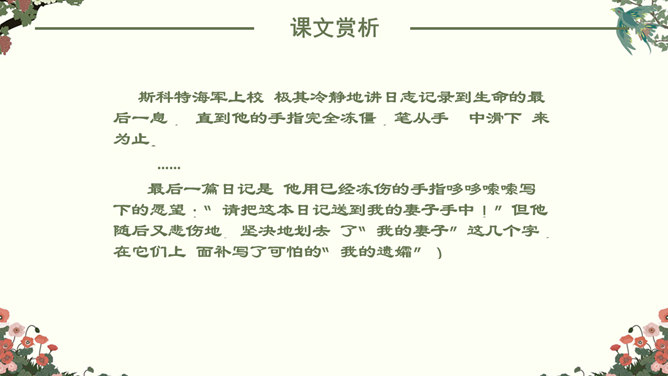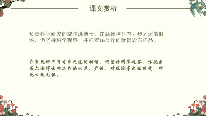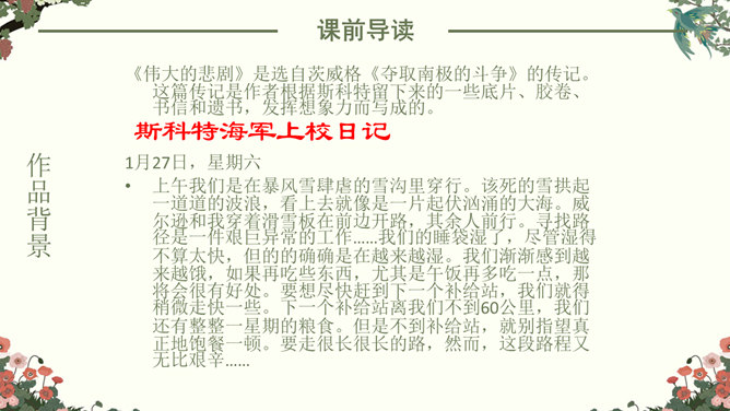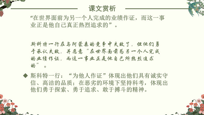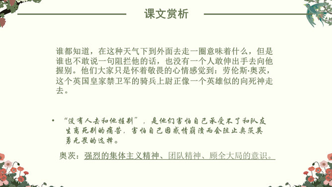 找出课文中“悲剧”的具体表现,在课文中勾画出来。抓住本文的中心事件,划分课文结构。简要概括故事,理清故事情节。“在世界面前为另一个人完成的业绩作证,而这一事业正是他自己真正热烈追求的”。斯科特一行在与阿蒙森的竞争中失败了,但他们勇于承认失败,并愿意“在世界面前为另一个人完成的业绩作证,而这一事业正是他自己所热烈追求的”。斯科特一行:“为他人作证”体现出他们具有诚实守信、高洁的品质;在恶劣的环境下坚持科考,体现出他们勇于探索、勇于追求、敢于搏斗的精神。负责科学研究的威尔逊博士,在离死神只有寸步之遥的时候,仍坚持科学观察,并拖着16公斤的珍贵岩石样品。在离死神只有寸步之遥的时候,仍坚持科学观察,体现出威尔逊博士对工作的认真、严谨,对探险事业的热爱,对死亡的无惧。谁都知道,在这种天气下到外面去走一圈意味着什么,但是谁也不敢说一句阻拦他的话,也没有一个人敢伸出手去向他握别。他们大家只是怀着敬畏的心情感觉到:劳伦斯·奥茨,这个英国皇家禁卫军的骑兵上尉正像一个英雄似的向死神走去。所属专题:伟大的悲剧ppt。