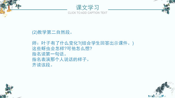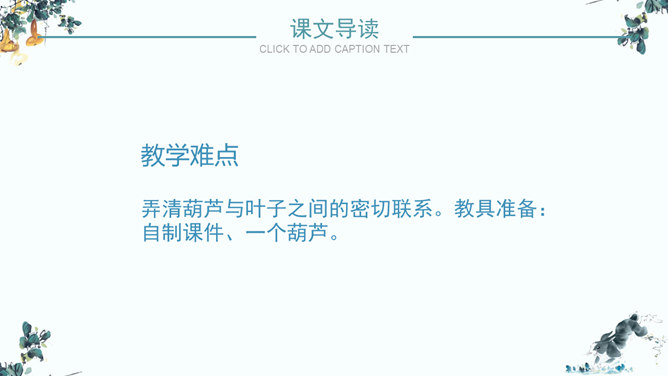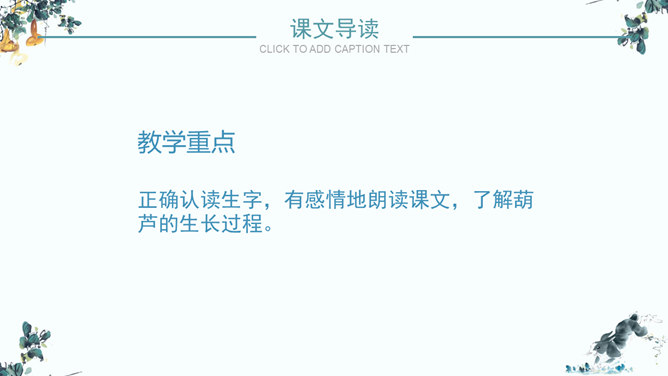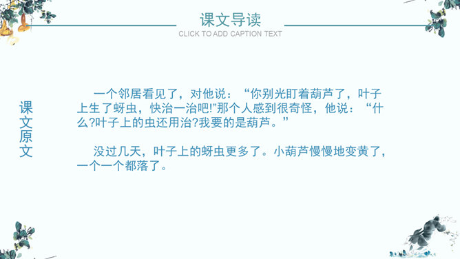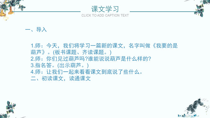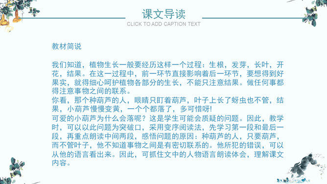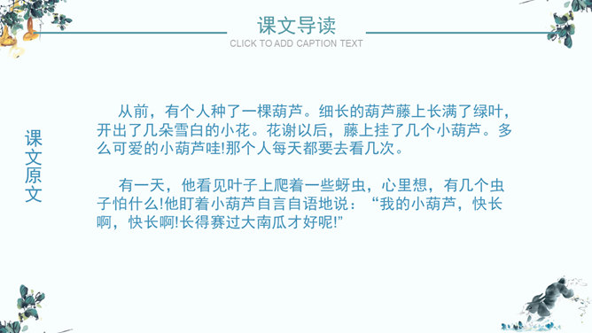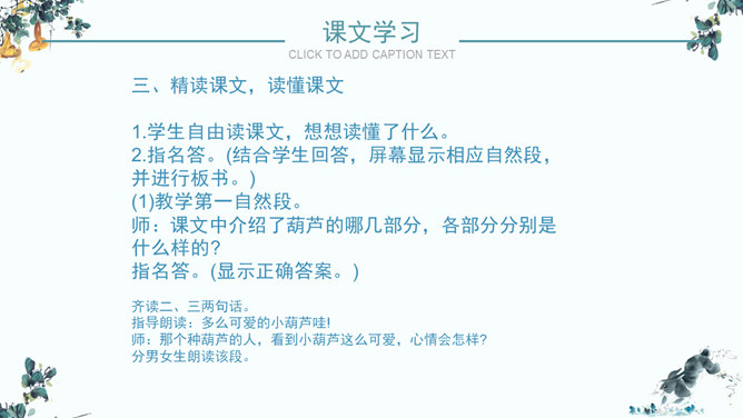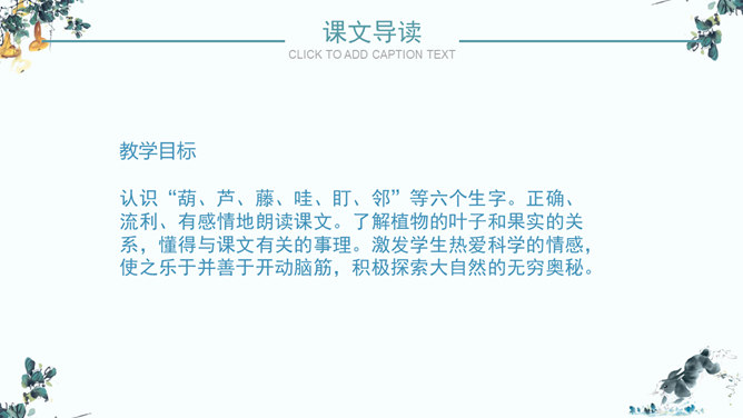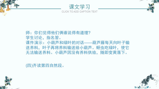 教学目标:认识“葫、芦、藤、哇、盯、邻”等六个生字。正确、流利、有感情地朗读课文。了解植物的叶子和果实的关系,懂得与课文有关的事理。激发学生热爱科学的情感,使之乐于并善于开动脑筋,积极探索大自然的无穷奥秘。教学重点:正确认读生字,有感情地朗读课文,了解葫芦的生长过程。教学难点:弄清葫芦与叶子之间的密切联系。教具准备:自制课件、一个葫芦。扩展练习1.小组讨论:种葫芦的人看到小葫芦都落了,会想些什么呢?2.小组代表汇报讨论结果。3.续讲故事:第二年,他又种了一棵葫芦,……4.指名讲故事。师:在邻居的帮助下,种葫芦的人明白了叶子和果实的关系,懂得了事物之间是相互有联系的,改变了过去只盯着葫芦,不管蚜虫的做法,最终种出了他想要的葫芦。所属专题:我要的是葫芦ppt。