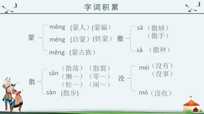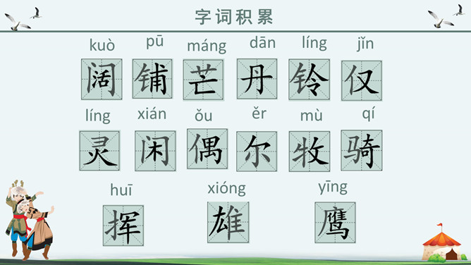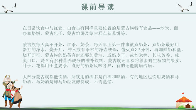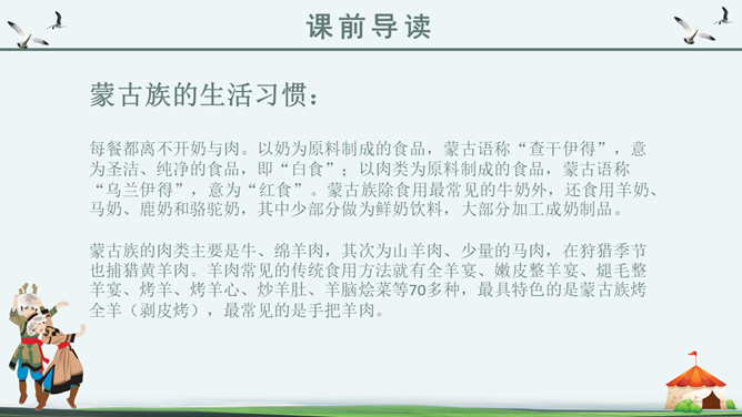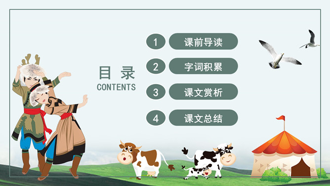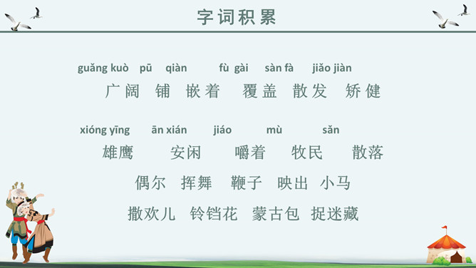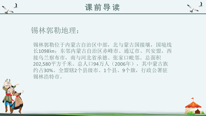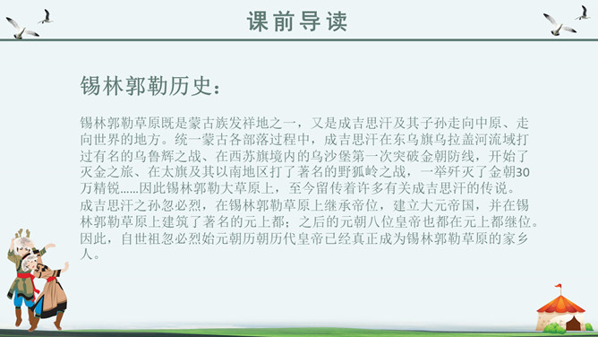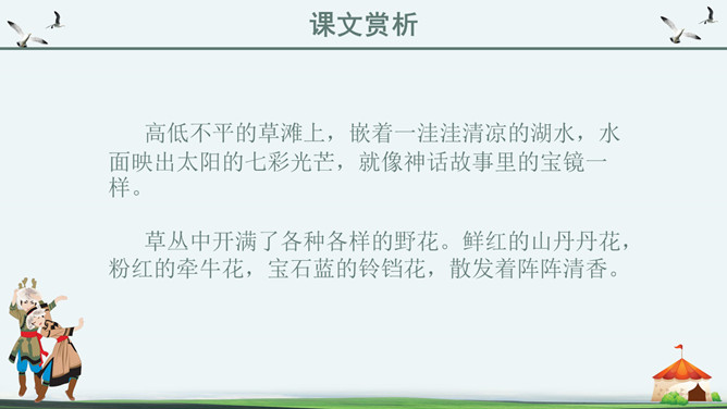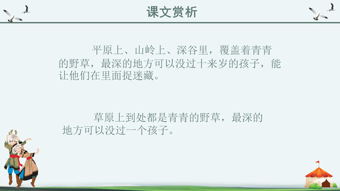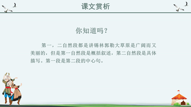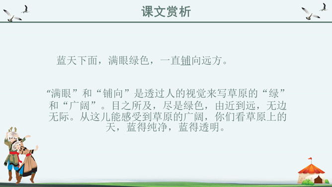 你知道吗?第一,二自然段都是讲锡林郭勒大草原是广阔而又美丽的,但是第一自然段是概括叙述,第二自然段是具体描写。第一段是第二段的中心句。“满眼”和“铺向”是透过人的视觉来写草原的“绿”和“广阔”。目之所及,尽是绿色,由近到远,无边无际。从这儿能感受到草原的广阔,你们看草原上的天,蓝得纯净,蓝得透明。平原上、山岭上、深谷里,覆盖着青青的野草,最深的地方可以没过十来岁的孩子,能让他们在里面捉迷藏。草原上到处都是青青的野草,最深的地方可以没过一个孩子。这一自然段只有一句话,前半句是用来承上,下半句用以启下,具有上下文间过度的作用,这样的段落叫做过渡段。