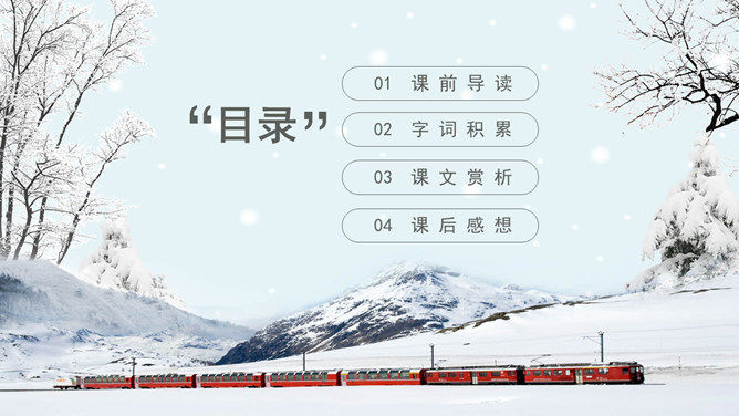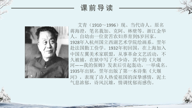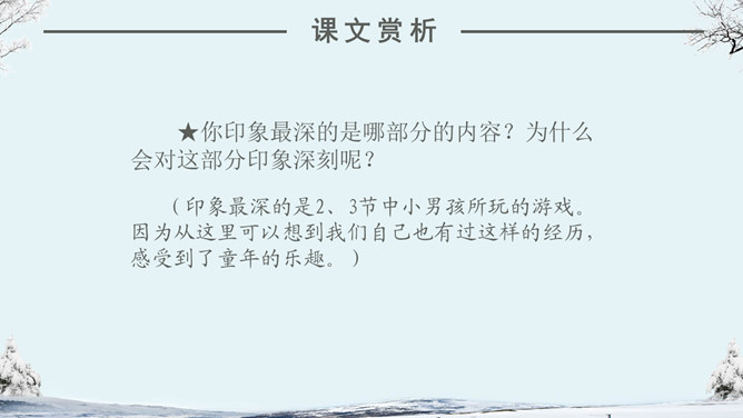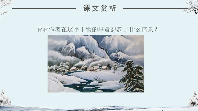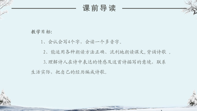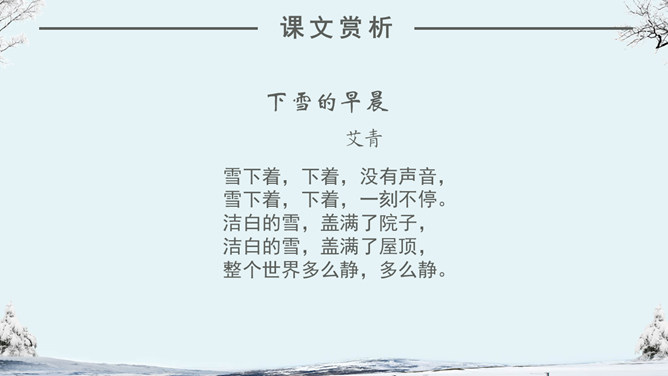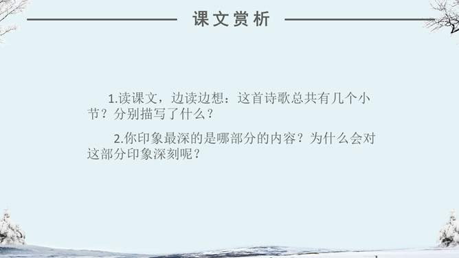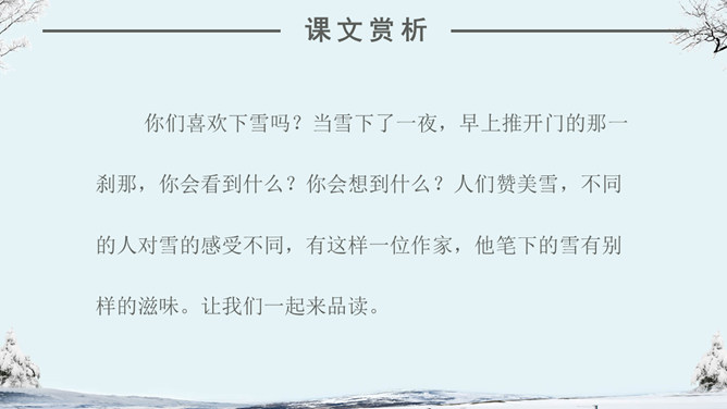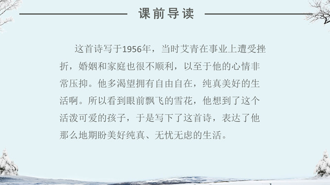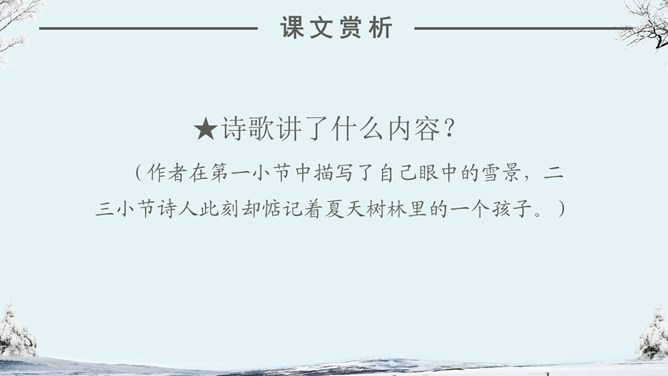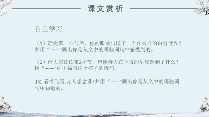 看看作者在这个下雪的早晨想起了什么情景?你们喜欢下雪吗?当雪下了一夜,早上推开门的那一刹那,你会看到什么?你会想到什么?人们赞美雪,不同的人对雪的感受不同,有这样一位作家,他笔下的雪有别样的滋味。让我们一起来品读。自主学习(1)读完第一小节后,你的眼前出现了一个什么样的白雪世界?并用“——”画出你是从文中的哪些词句中感受到的。(2)请大家读读第2小节,想像诗人在下雪的早晨想到了什么?用“——”画出描写这个孩子的诗句。(3) 看着飞雪,诗人想念谁?并用“——”画出你是从文中的哪些词句中知道的。1.读课文,边读边想:这首诗歌总共有几个小节?分别描写了什么?2.你印象最深的是哪部分的内容?为什么会对这部分印象深刻呢?人们常常在冬天时想着夏天,夏天时想着冬天,你有过着类似的经历吗?