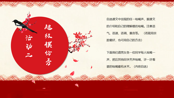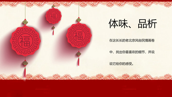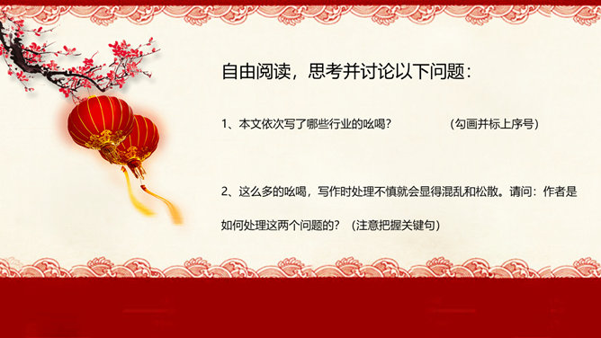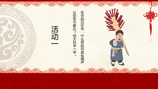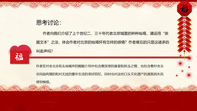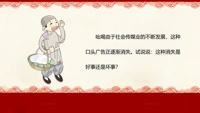 听听这是什么声音?在你的记忆中,什么样的叫卖吆喝声让你至今难忘?给大伙学一学。作者向我们介绍了上个世纪二、三十年代老北京城里的种种吆喝,请运用“依据文本”之法,体会作者对北京的吆喝怀有怎样的感情?作者难忘的只是这诸多的叫卖声吗?作者在对老北京街头吆喝声的娓娓介绍中包含着深厚的喜爱和怀念之情,也包含着对老北京民俗风情的和对无忧的童年生活的美好回忆,同时也对这些口头文化遗产的逐渐消失而感到惋惜。吆喝由于社会传媒业的不断发展,这种口头广告正逐渐消失。试说说:这种消失是好事还是坏事?自选课文中出现的任一吆喝声,据课文的介绍和自己的理解模仿吆喝。注意语气、语速、语调、重音等。 (若能用京腔最好,也可用自己的方言),下面我们请男女各一位同学每人吆喝一声,然后其他同学齐声吆喝,评一评看谁的吆喝最有水平。(内容自选)。