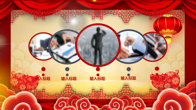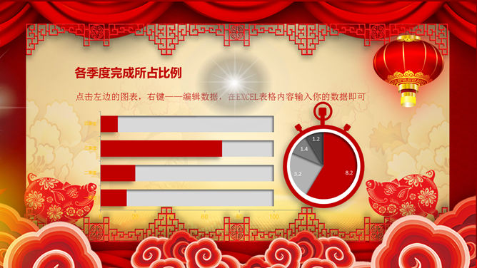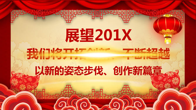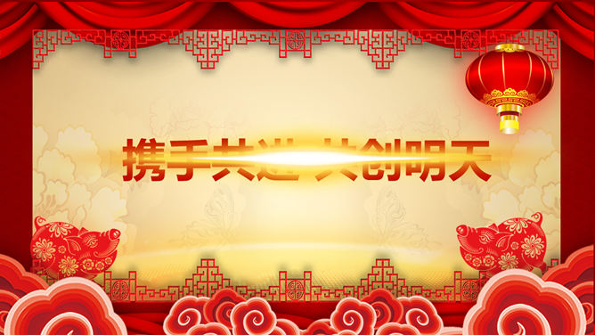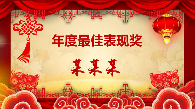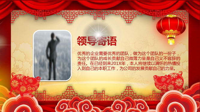 喜庆新年春节年会PPT模板。一套喜庆猪年春节公司年会幻灯片模板,包括领导致辞,成果总结,颁奖典礼几部分。