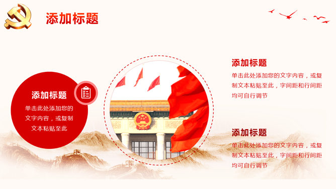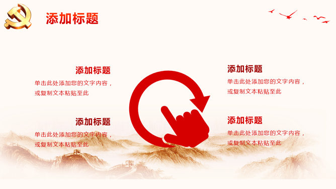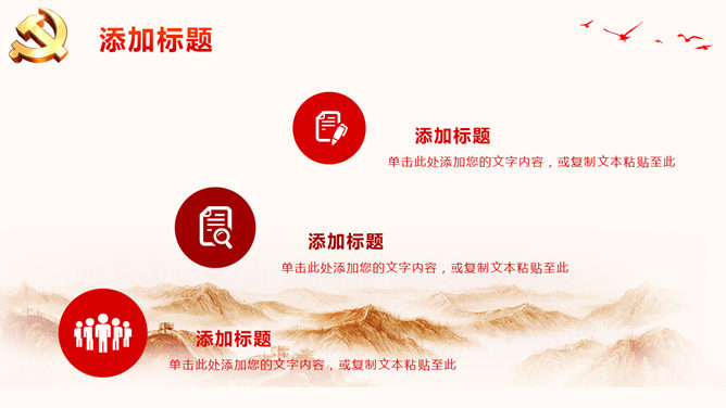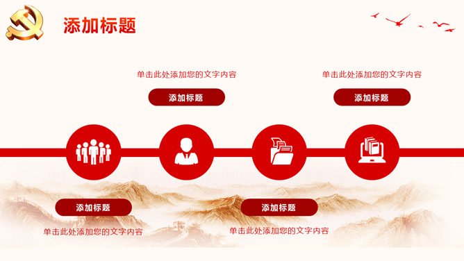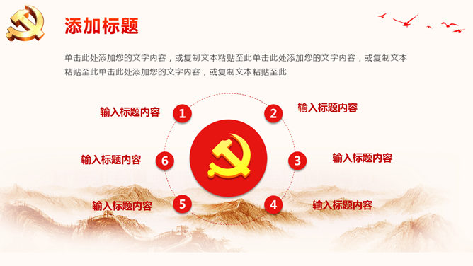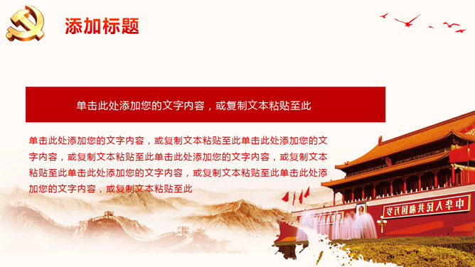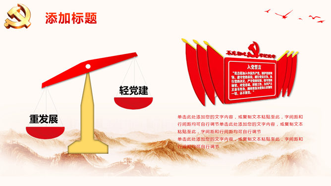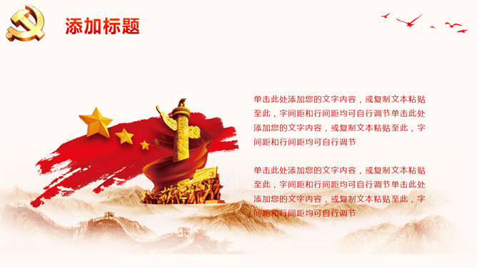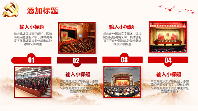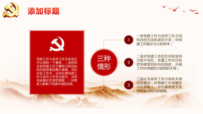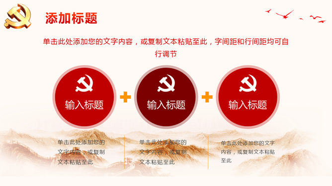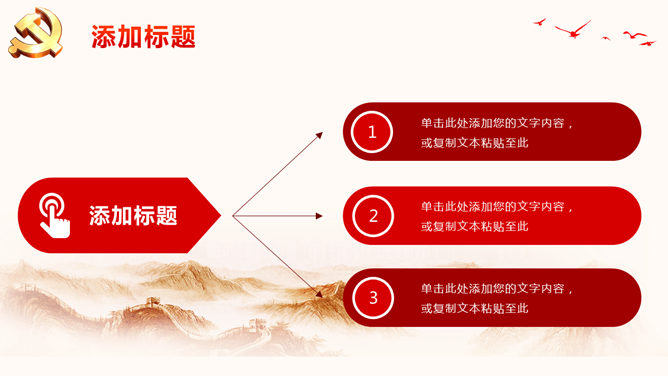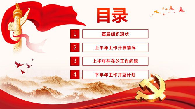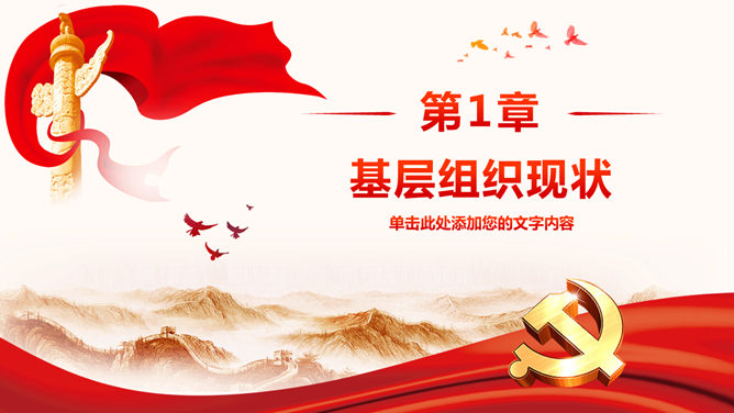 党课党建工作汇报PPT模板。一套党政主题幻灯片模板,大气红色主色调,适合党课课件,党建工作报告等用途。