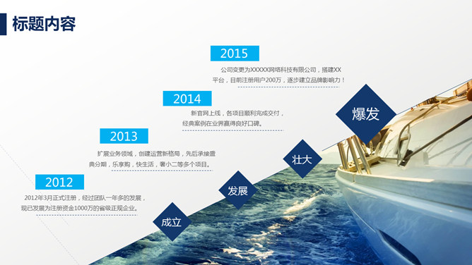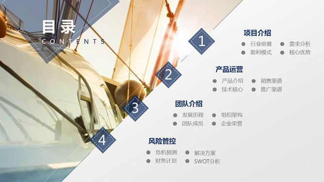 扬帆起航帆船商务PPT模板。一套商务风幻灯片模板,大气蓝色主色调,扬帆起航的帆船背景,适合商务主题。