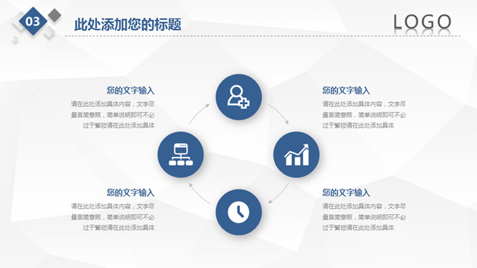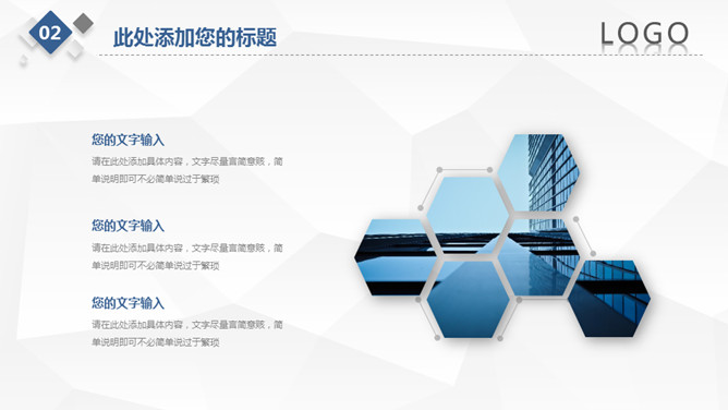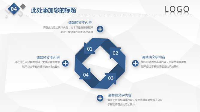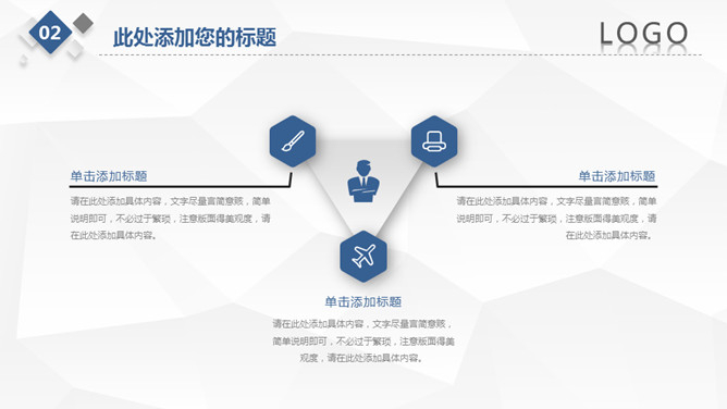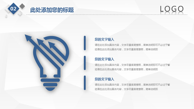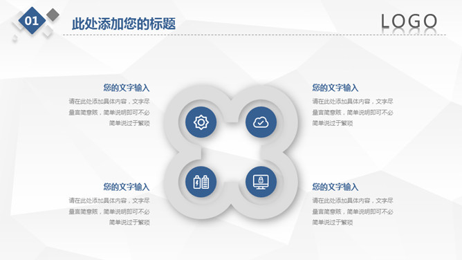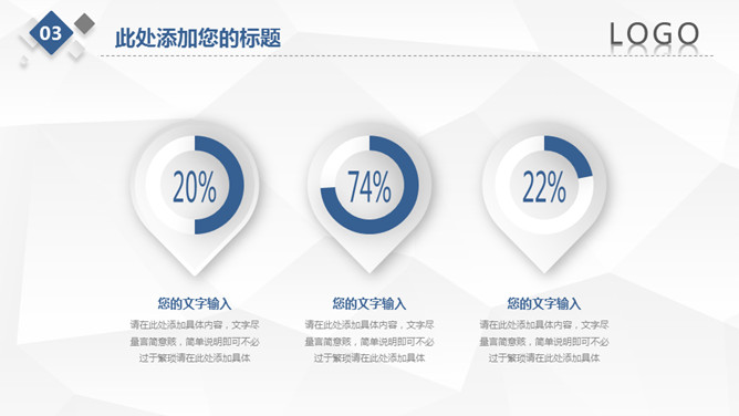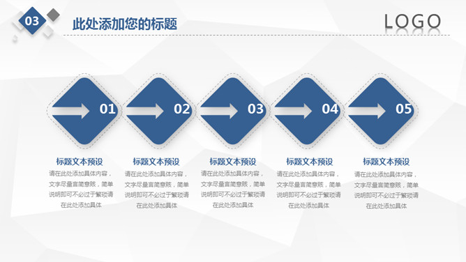 简约微立体工作总结PPT模板。一套工作总结汇报幻灯片模板,浅灰低面多边形背景,大气蓝色主色调,微立体效果。