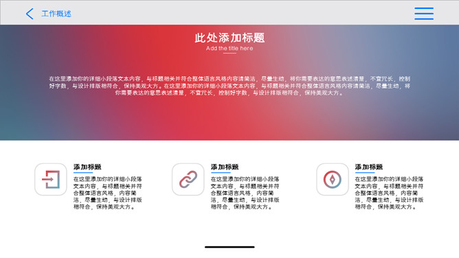 创意苹果IOS风格PPT模板。一套创意设计幻灯片模板,苹果IOS设计风格,彩色渐变背景,半透明效果。