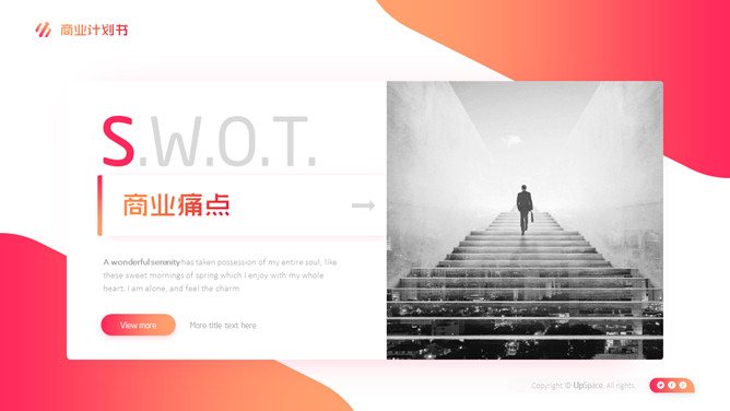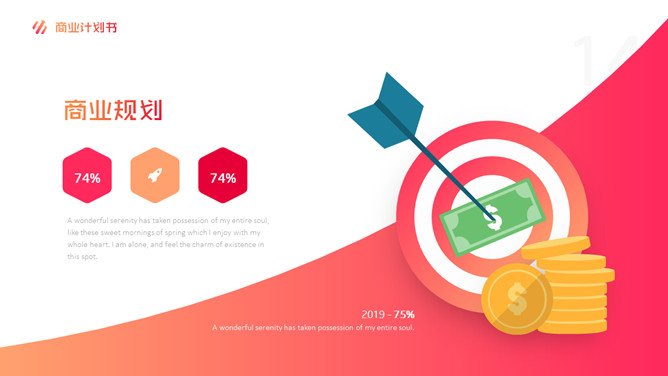 时尚渐变商业计划PPT模板。一套时尚商务风格幻灯片模板,橙红渐变风格,创意排版布局,适合创业计划书等场景。