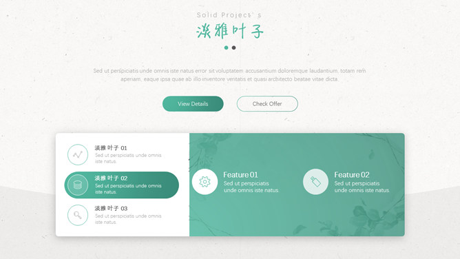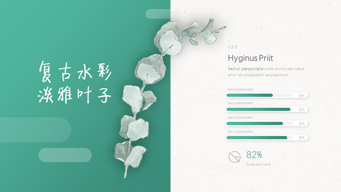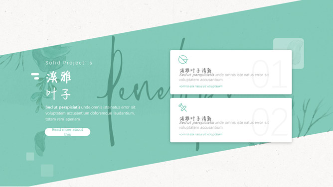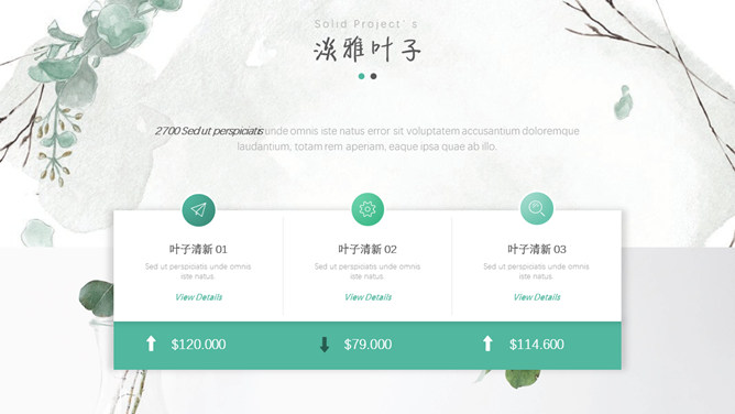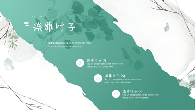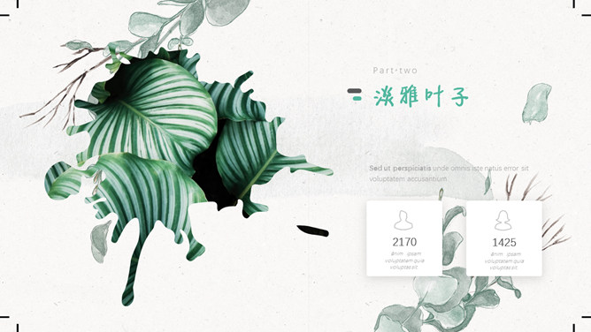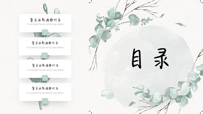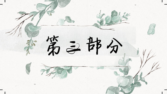 淡雅清新文艺森系PPT模板。一套文艺范幻灯片模板,清新绿色主色调,森系叶子藤蔓装饰,唯美淡雅,动态播放。
