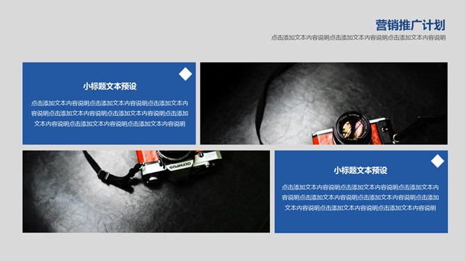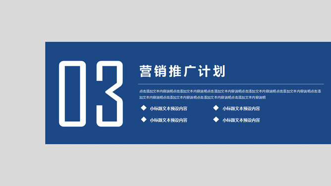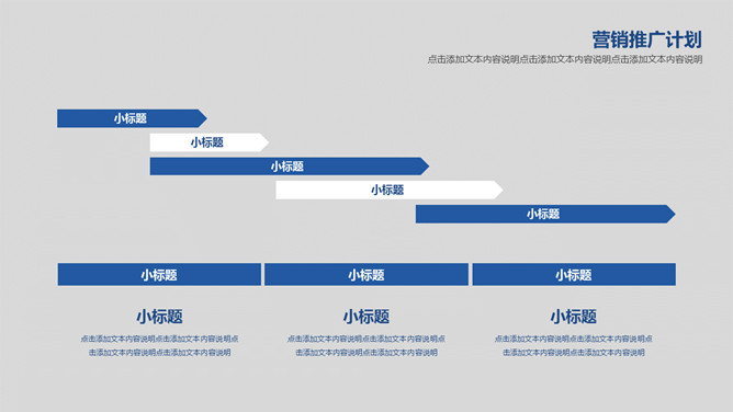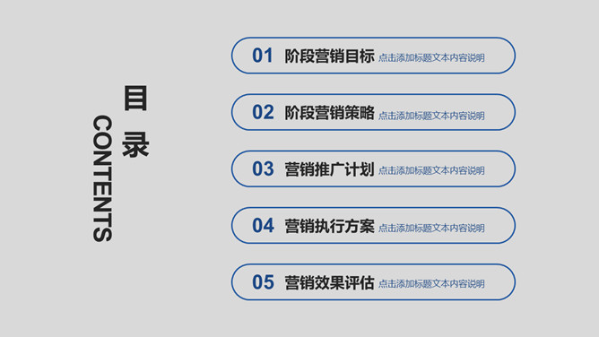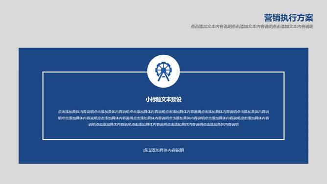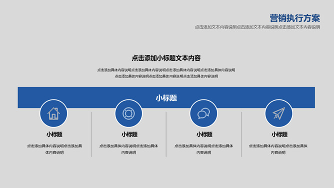 简约大气营销执行方案PPT模板。一套营销执行方案幻灯片模板,灰色背景,蓝色主色调,简约大气稳重商务风格。