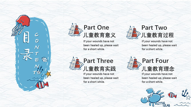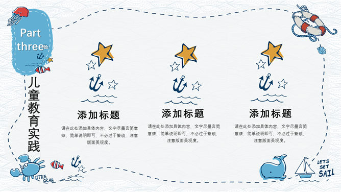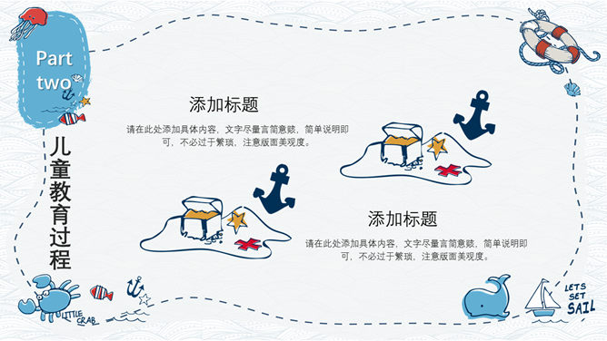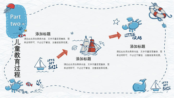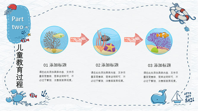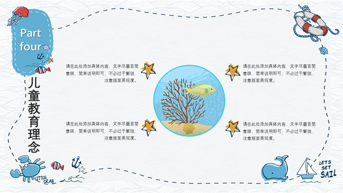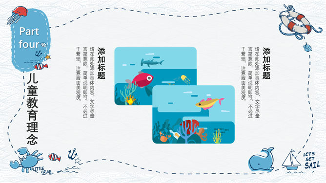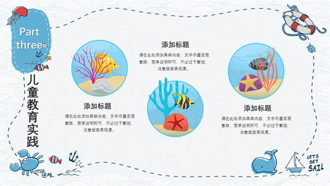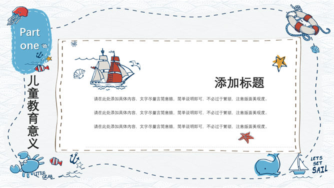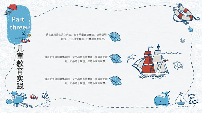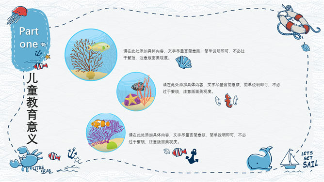 手绘可爱卡通海洋风PPT模板。一套精美卡通风格幻灯片模板,创意海洋风格,可爱手绘效果设计,清新蓝色配色。
