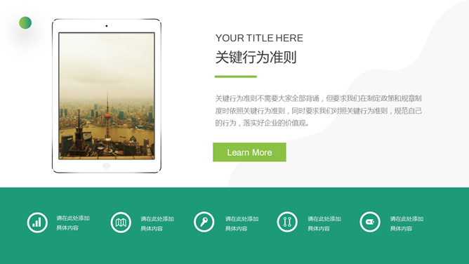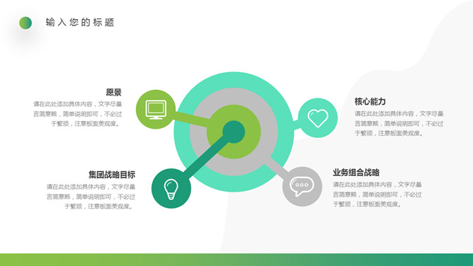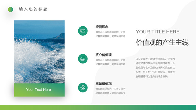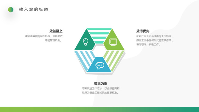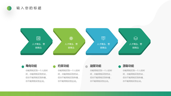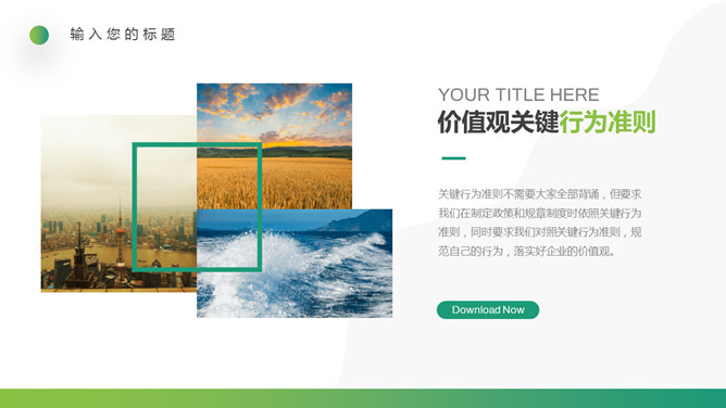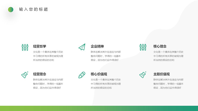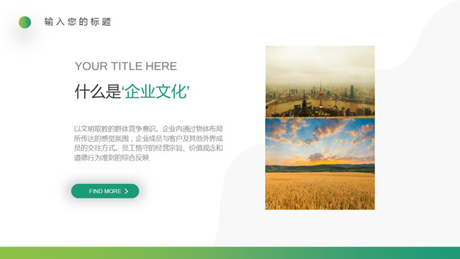 企业文化培训PPT课件模板。一套培训课件幻灯片模板,清新渐变绿色配色,简约设计,适合制作企业文化培训相关课件。