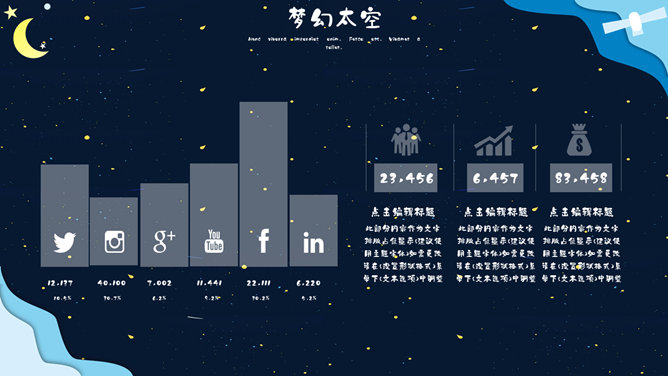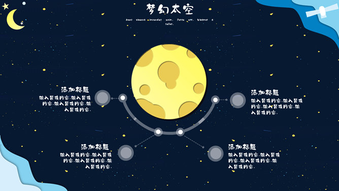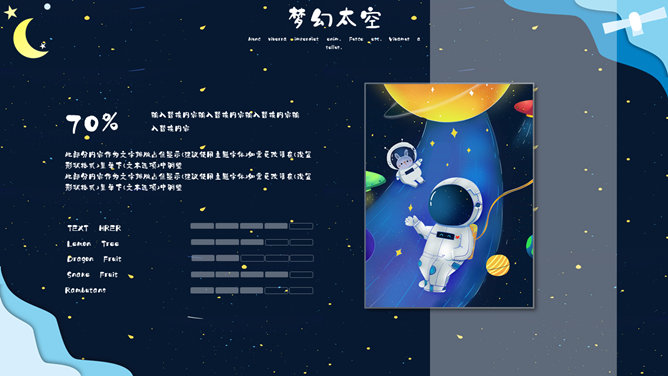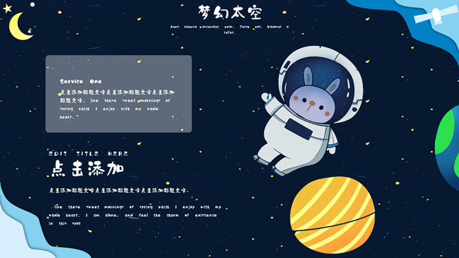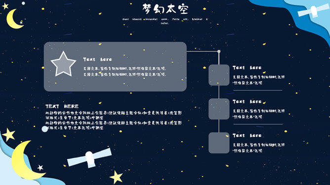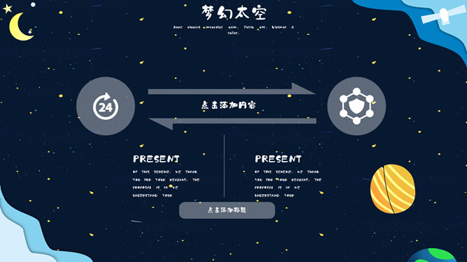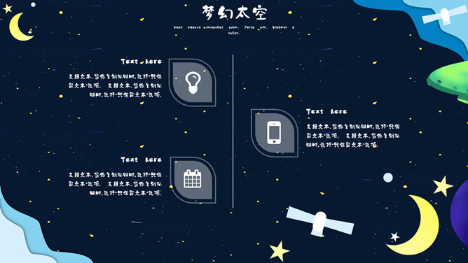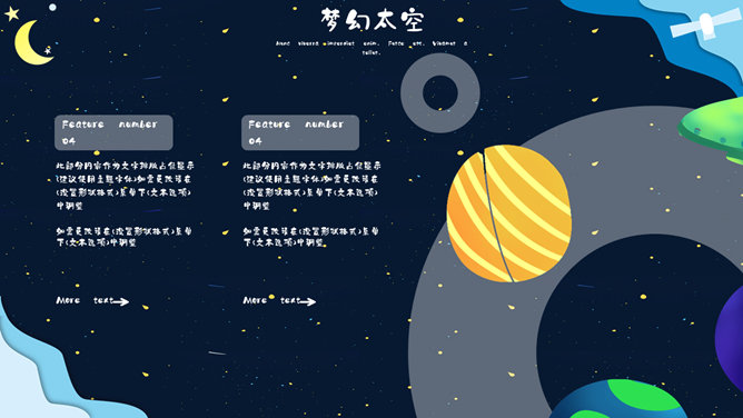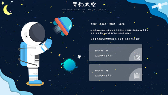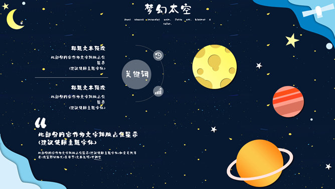 科幻儿童宇宙太空PPT模板。一套矢量卡通风格幻灯片模板,宇宙星球太空元素设计,适合科学相关儿童教学使用。