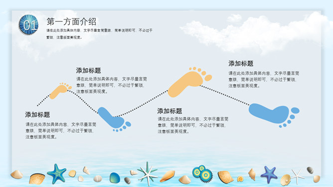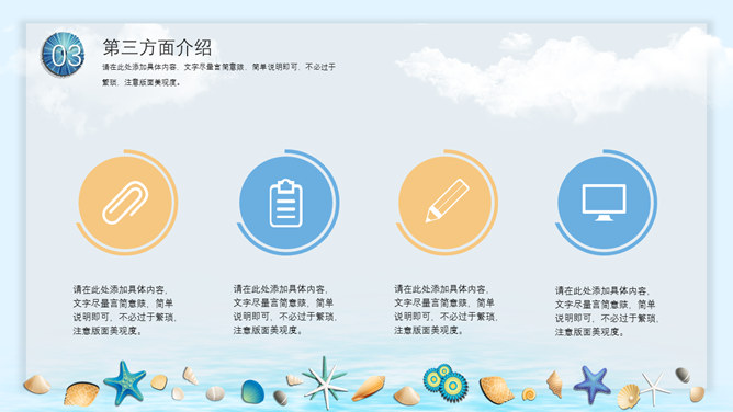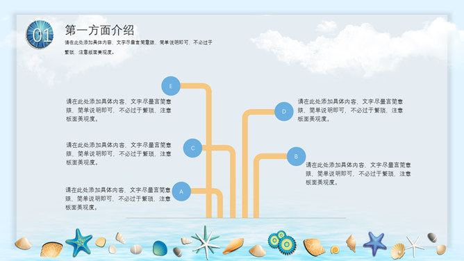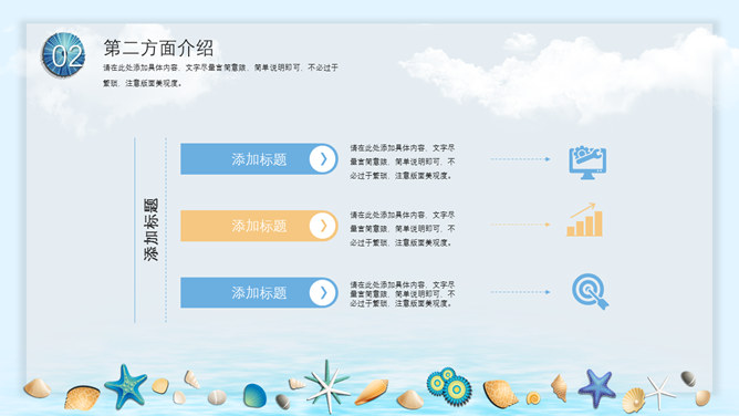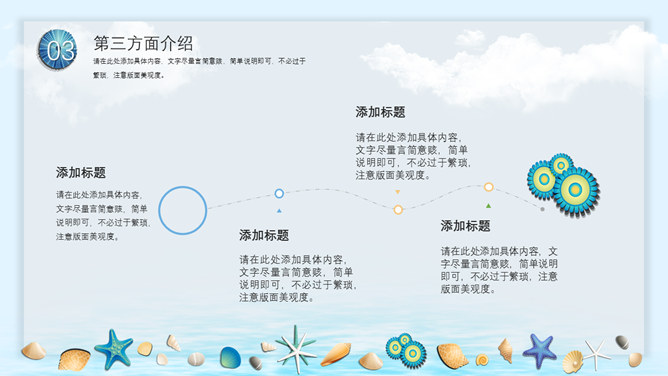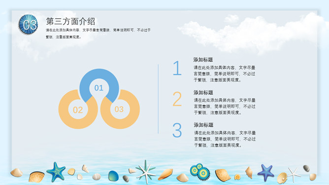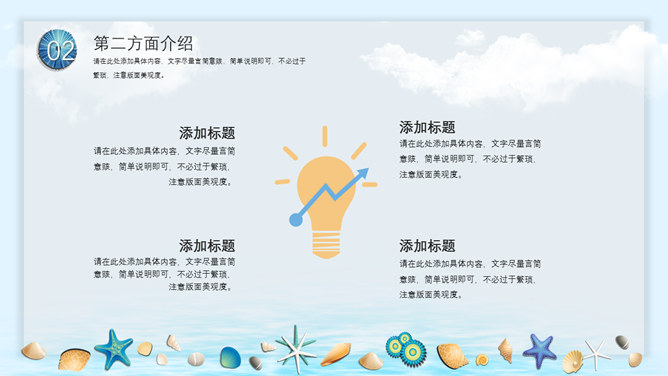 创意贝壳海洋风PPT模板。一套非常有创意的幻灯片模板,清新蓝色主色调,各种各样的贝壳装饰,海洋风设计风格。