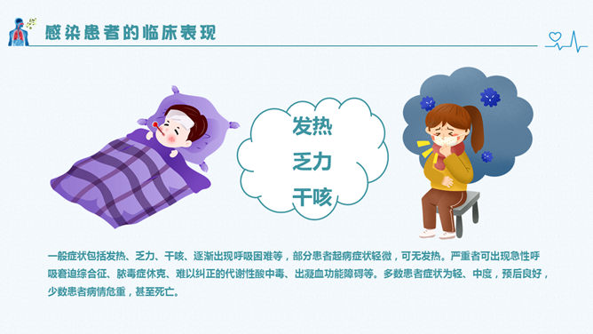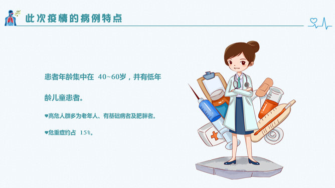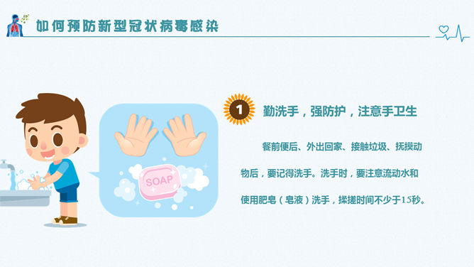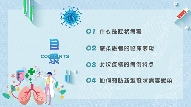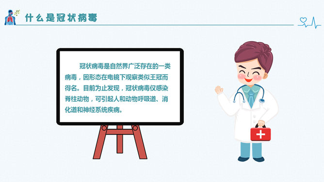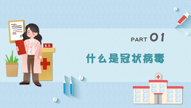 新型冠状病毒肺炎预防PPT模板。包括:什么是冠状病毒、感染患者的临床表现、此次疫情的病例特点、如何预防新型冠状病毒感染几个部分。