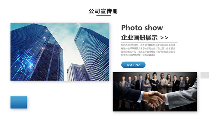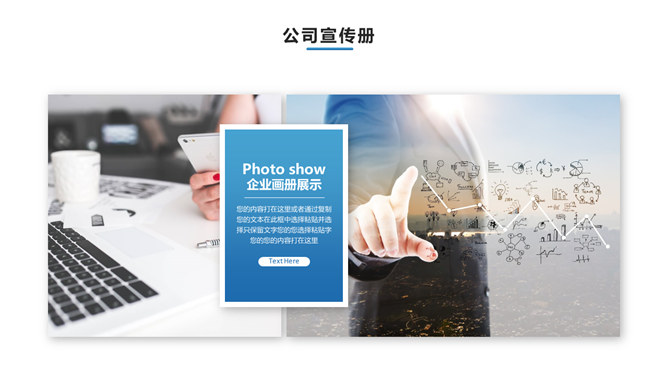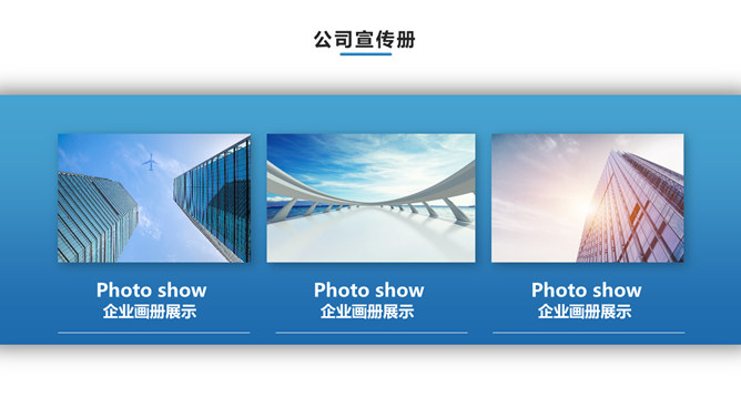 公司宣传介绍画册PPT模板。一套公司企业宣传介绍简介幻灯片模板,包含多种创意图片排版,简约大气,动态播放。