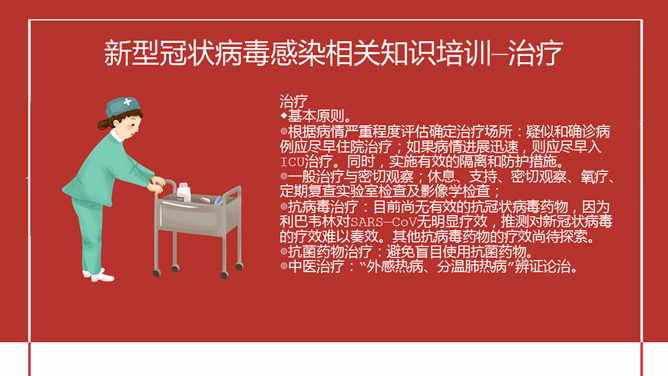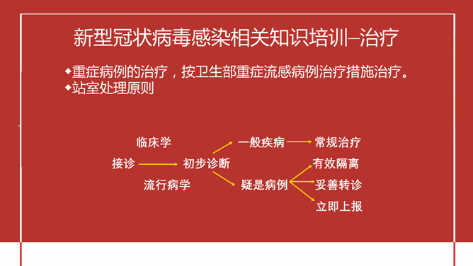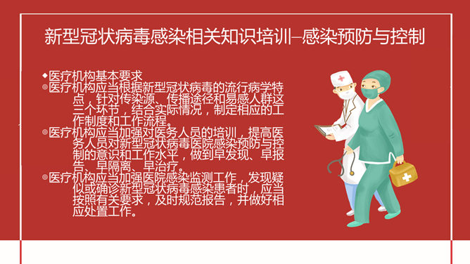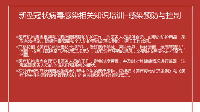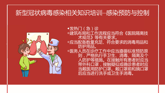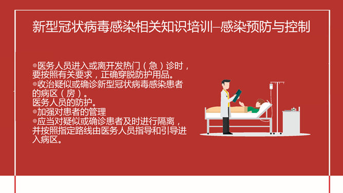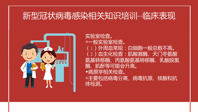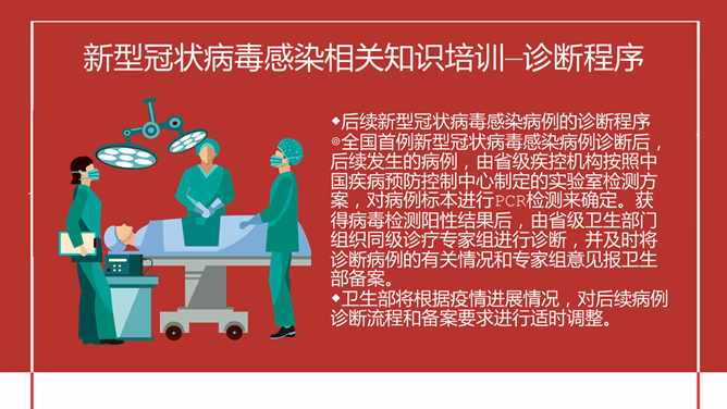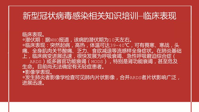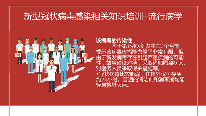新型冠状病毒知识培训PPT模板。包括前言、流行病学、临床表现、临床诊断、感染预防与控制、诊断程序几个部分。