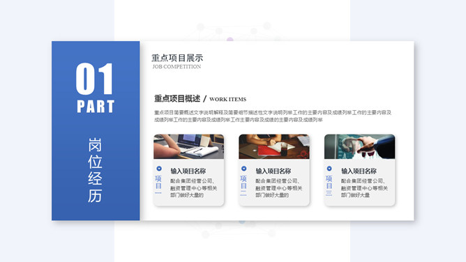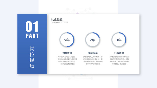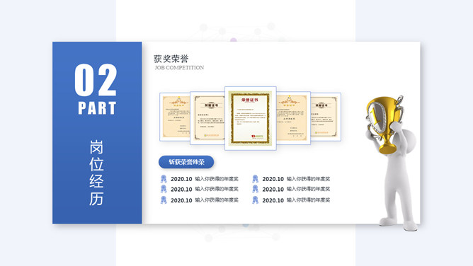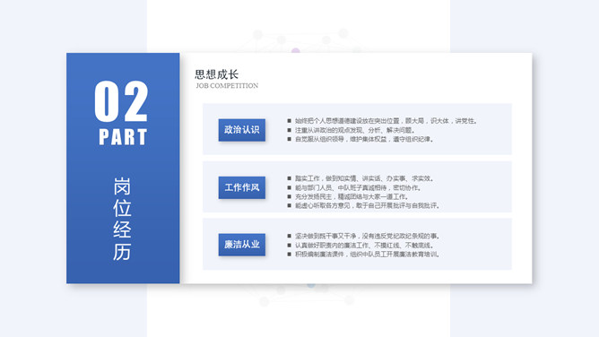 竞聘岗位个人简历PPT模板。一套个人简历幻灯片模板,清新大气蓝色主色调,悬浮卡片视觉效果,适合求职竞聘用途。