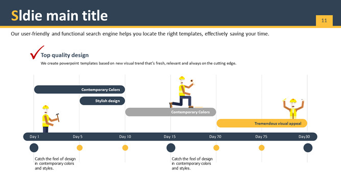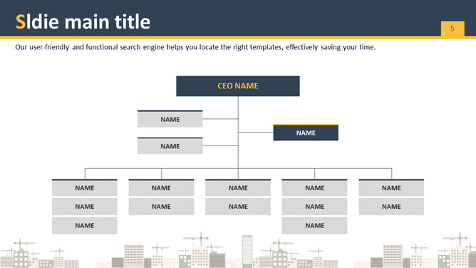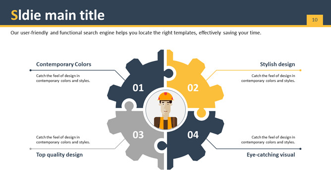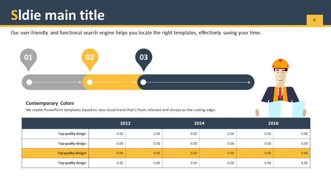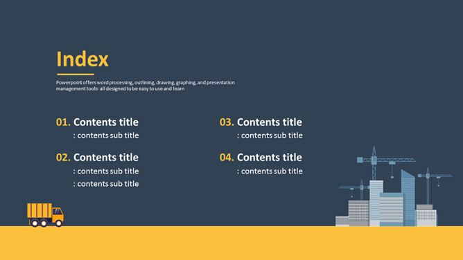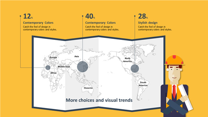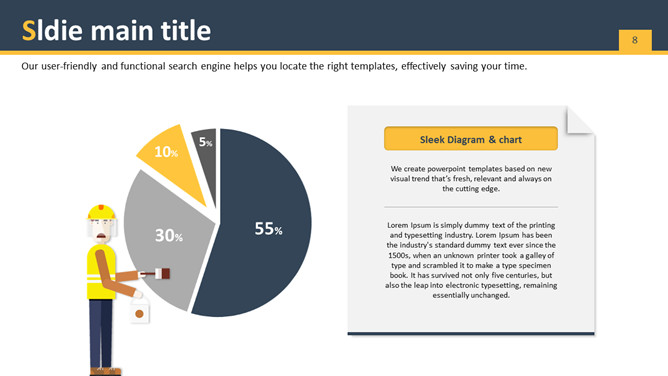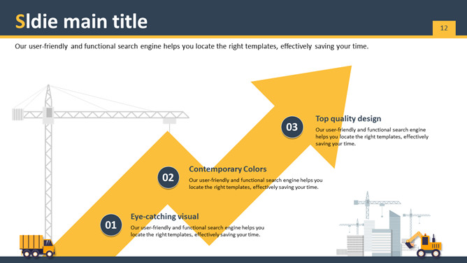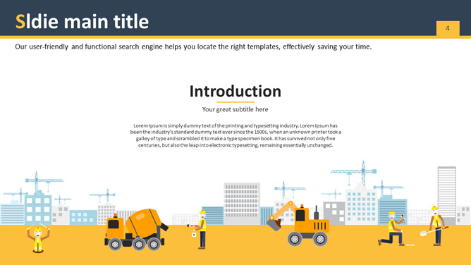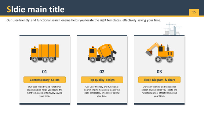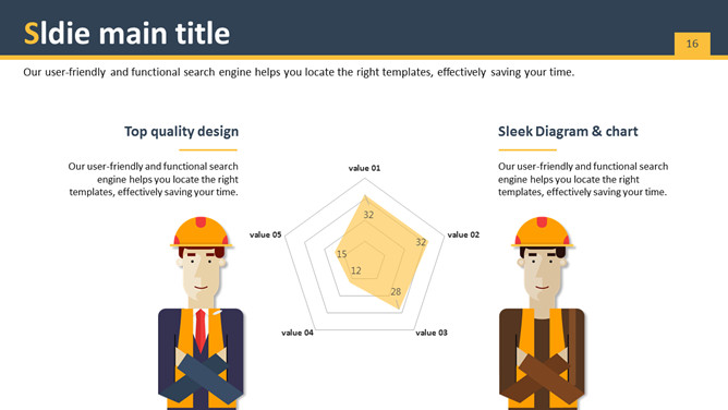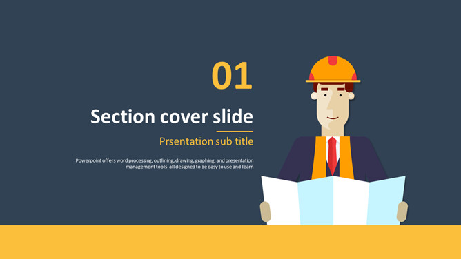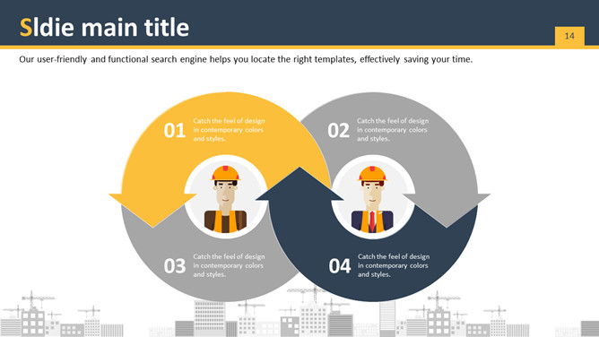 建筑工程施工管理PPT模板。一套建筑施工相关幻灯片模板,页面类型丰富,实用性强,扁平化设计风格,有设计感。