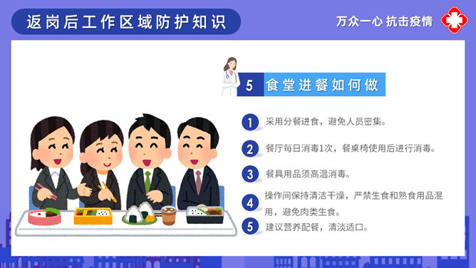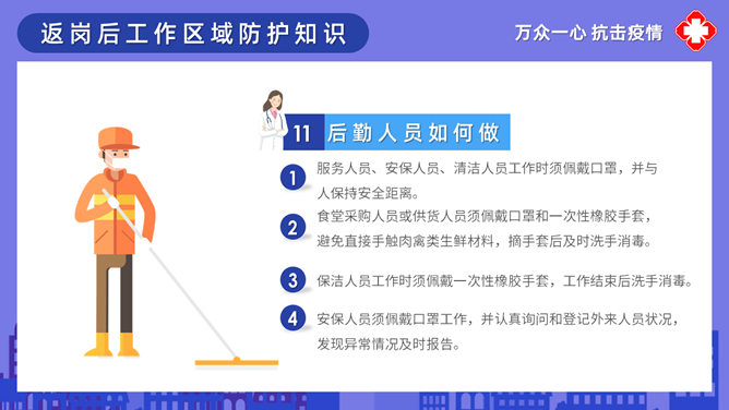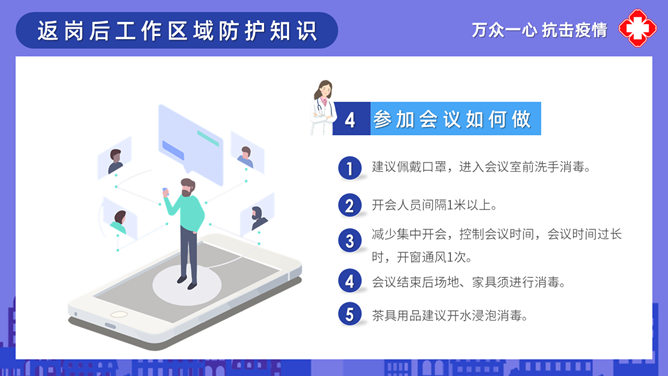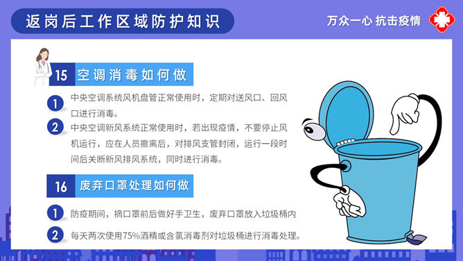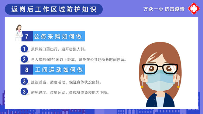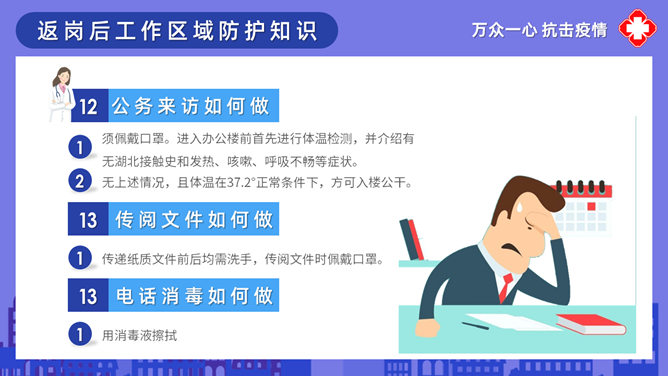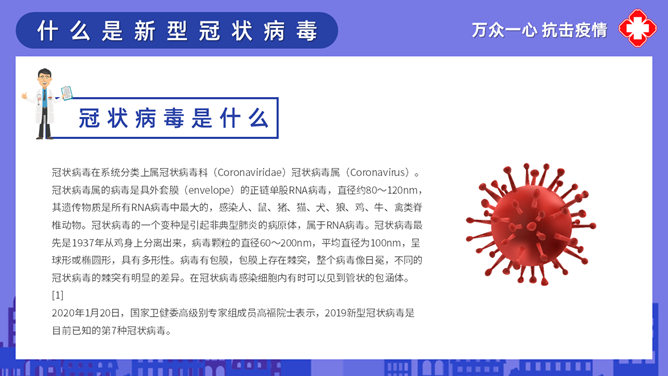返岗复工新冠病毒预防PPT模板。一套新型冠状病毒病毒预防知识宣讲幻灯片模板,适合返岗上班复工复学培训使用。
