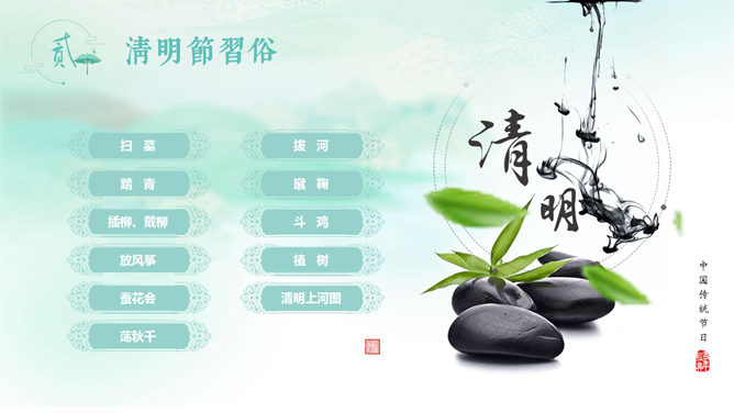 水墨风传统清明节PPT模板。一套精美清明节主题幻灯片模板,彩色水墨风设计,素材丰富实用,动态播放效果。