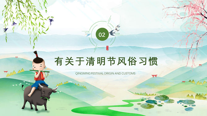 牧童清明节习俗介绍PPT模板。一套清明节起源历史、习俗介绍幻灯片模板,可爱卡通牧童、春天背景,动态播放效果。