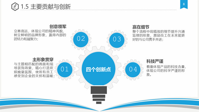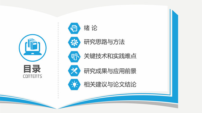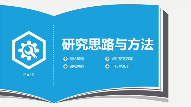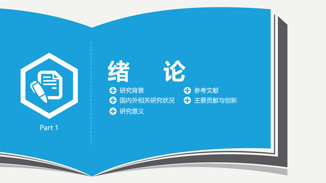 书本风格论文答辩PPT模板。一套毕业论文答辩幻灯片模板,清新蓝色主色调,创意抽象翻开书本书籍设计,页面丰富。