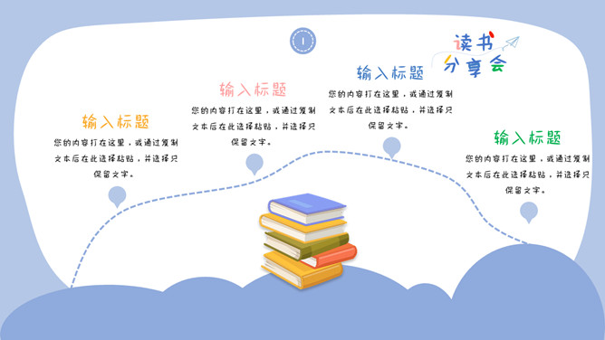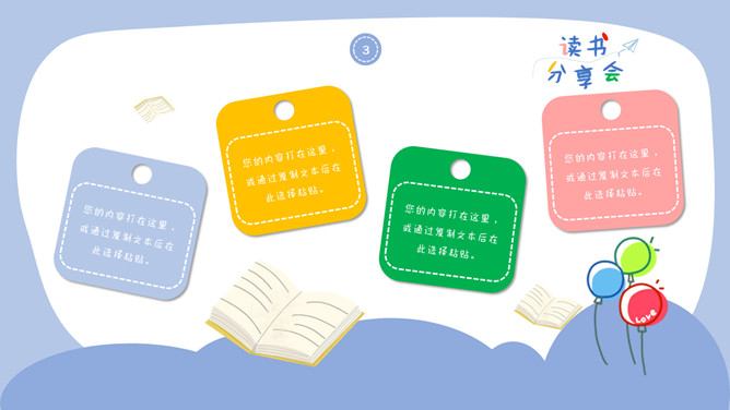 卡通可爱读书分享会PPT模板。一套读书分享会幻灯片模板,可爱卡通设计风格,清新多彩配色,动态播放效果。