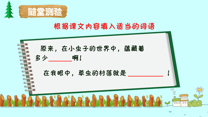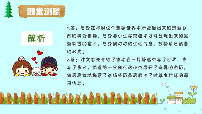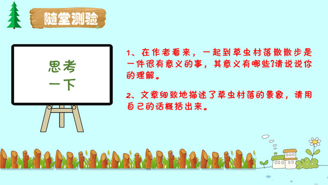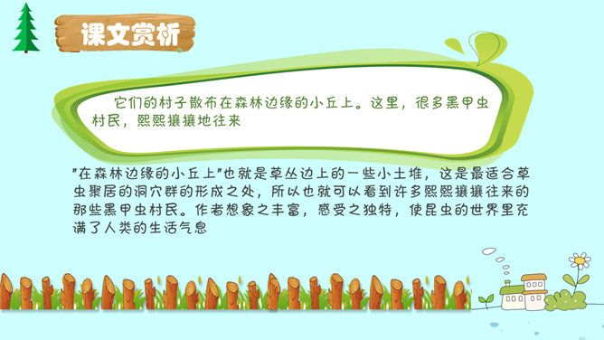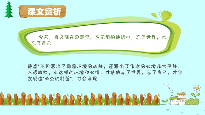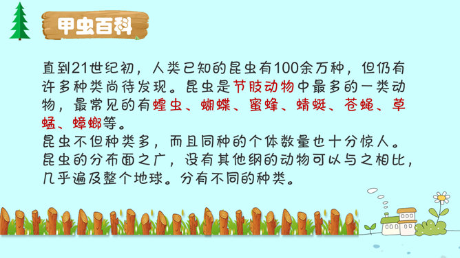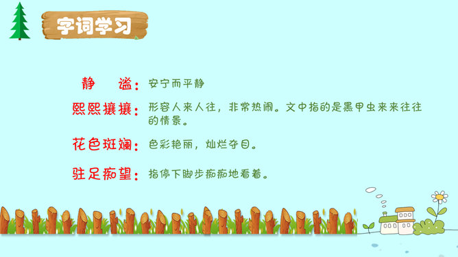 直到21世纪初,人类已知的昆虫有100余万种,但仍有许多种类尚待发现。昆虫是节肢动物中最多的一类动物,最常见的有蝗虫、蝴蝶、蜜蜂、蜻蜓、苍蝇、草蜢、蟑螂等。静谧:安宁而平静。熙熙攘攘:形容人来人往,非常热闹。文中指的是黑甲虫来来往往的情景。花色斑斓:色彩艳丽,灿烂夺目。驻足痴望:指停下脚步痴痴地看着。静谧"不但写出了周围环境的幽静,还写出了作者的心境非常平静、人很放松。有这样的环境和心情,才使他忘了世界,忘了自己,才会发现这"草虫的村落",才会发现