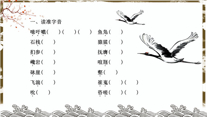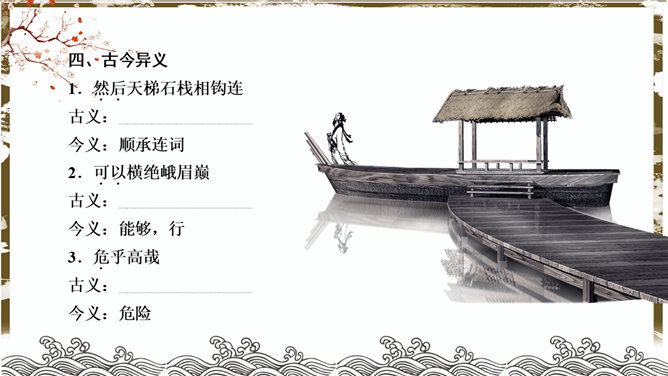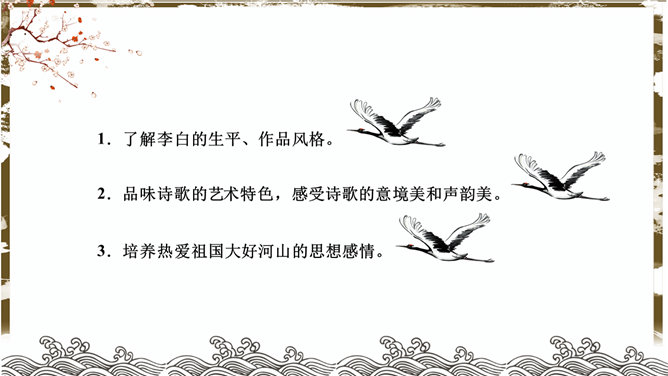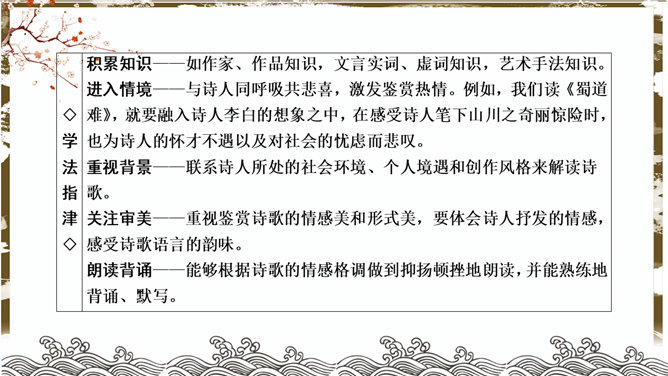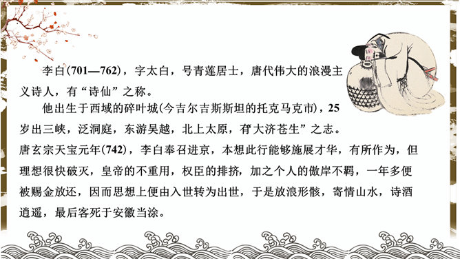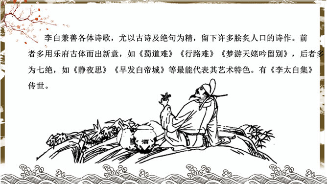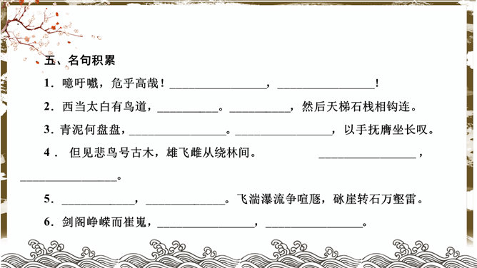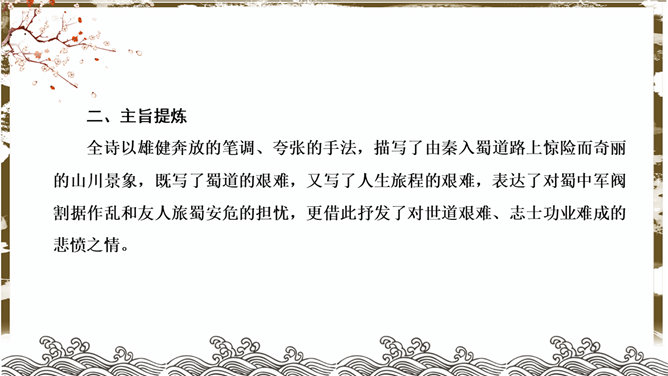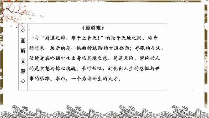 蜀道难PPT课件。了解李白的生平、作品风格。品味诗歌的艺术特色,感受诗歌的意境美和声韵美。培养热爱祖国大好河山的思想感情。李白兼善各体诗歌,尤以古诗及绝句为精,留下许多脍炙人口的诗作。神话传说:五丁开山、六龙回日——写出历史上蜀道不可逾越之险阻。虚写映衬:黄鹤不得飞渡、猿猱愁于攀援——映衬人行走难上加难。摹写神情、动作:手扪星辰、呼吸紧张、抚胸长叹、步履艰难、神情惶悚——困危之状如在眼前。