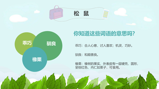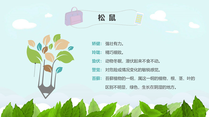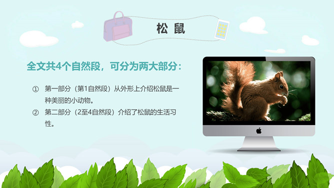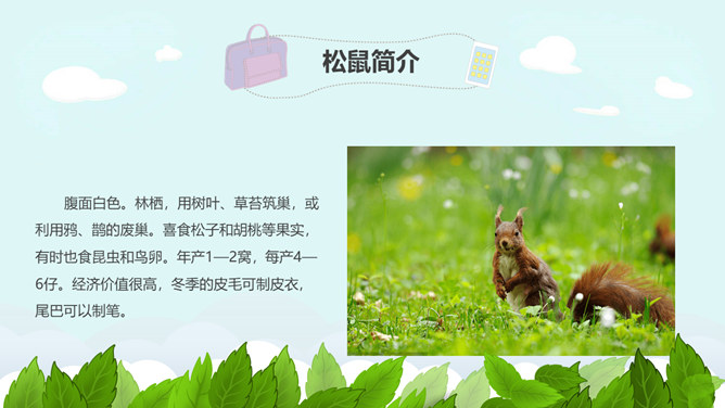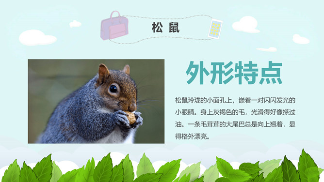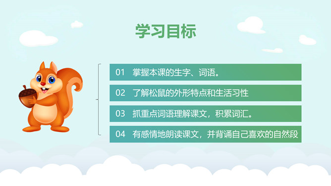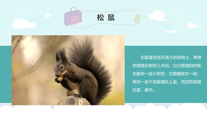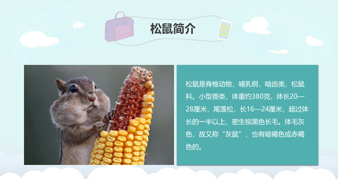 学习目标:掌握本课的生字、词语。了解松鼠的外形特点和生活习性。抓重点词语理解课文,积累词汇。有感情地朗读课文,并背诵自己喜欢的自然段。松鼠是脊椎动物,哺乳纲,啮齿类,松鼠科。小型兽类,体重约380克,体长20—28厘米,尾蓬松,长16—24厘米,超过体长的一半以上,密生棕黑色长毛。体毛灰色,故又称“灰鼠”,也有暗褐色或赤褐色的。腹面白色。林栖,用树叶、草苔筑巢,或利用鸦、鹊的废巢。喜食松子和胡桃等果实,有时也食昆虫和鸟卵。年产1—2窝,每产4—6仔。经济价值很高,冬季的皮毛可制皮衣,尾巴可以制笔。所属专题:松鼠ppt。