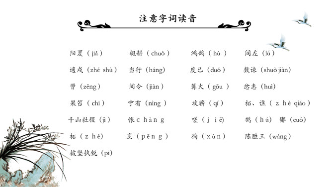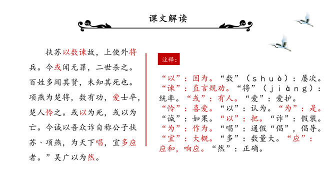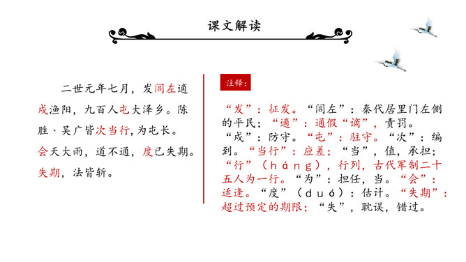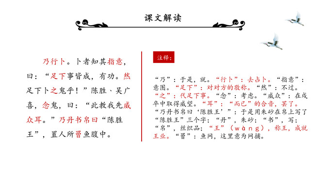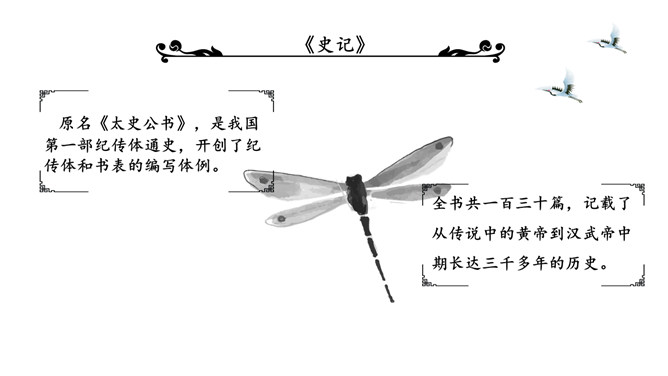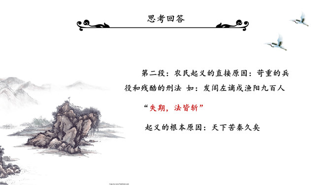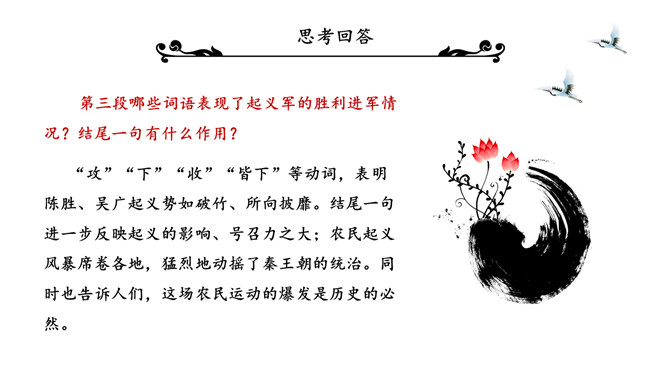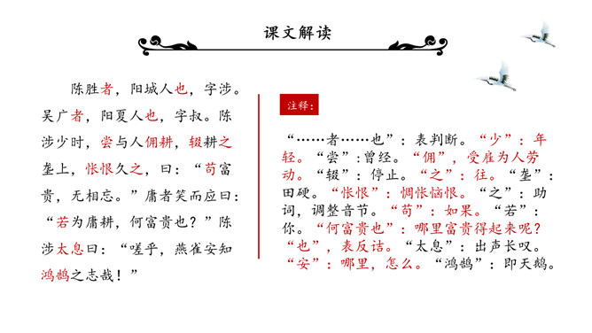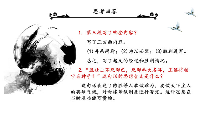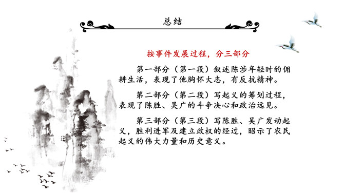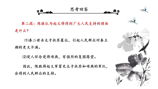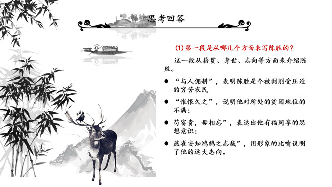 陈涉世家PPT课件。原名《太史公书》,是我国第一部纪传体通史,开创了纪传体和书表的编写体例。全书共一百三十篇,记载了从传说中的黄帝到汉武帝中期长达三千多年的历史。从籍贯、身世、志向等方面来介绍陈胜。“与人佣耕”,表明陈胜是个被剥削受压迫的穷苦农民“怅恨久之”,说明他对所处的贫困地位的不满;苟富贵,毋相忘”,表达出他有福同享的思想意识;燕雀安知鸿鹄之志哉”,用形象的比喻说明了他的远大志向。