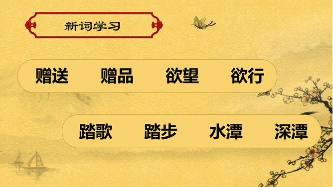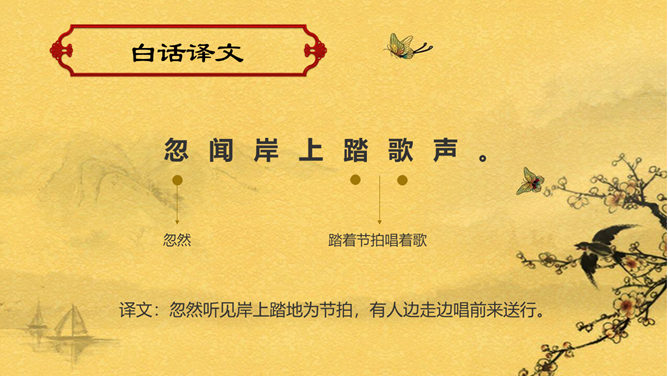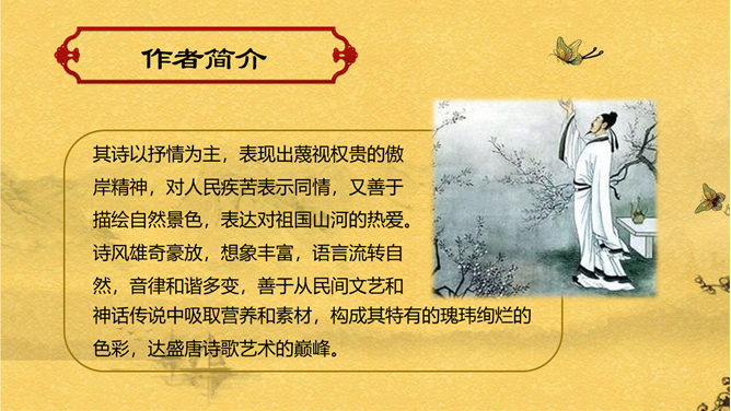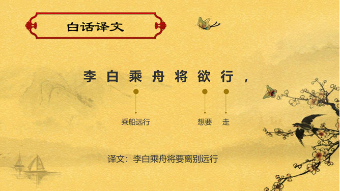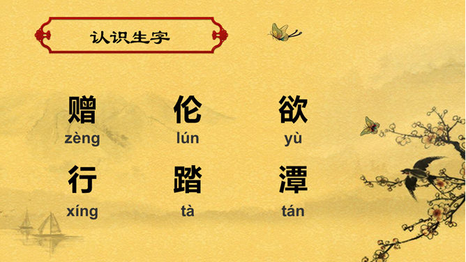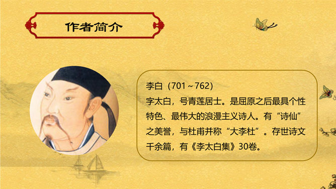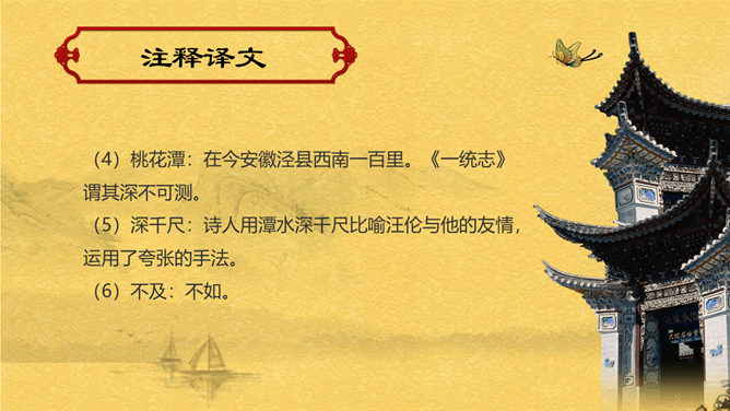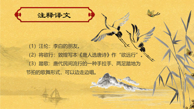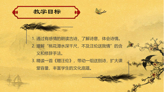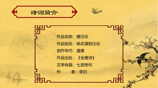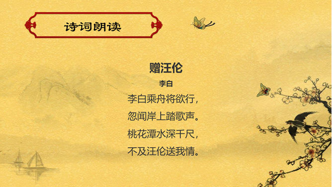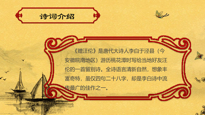 赠汪伦PPT课件。教学目标:通过有感情的朗读古诗,了解诗意,体会诗情。理解“桃花潭水深千尺,不及汪伦送我情”的含义和修辞手法。精读一首《赠汪伦》,带动一组送别诗,扩大课堂容量,丰富学生的文化底蕴。《赠汪伦》是唐代大诗人李白于泾县(今安徽皖南地区)游历桃花潭时写给当地好友汪伦的一首留别诗。全诗语言清新自然,想象丰富奇特,虽仅四句二十八字,却是李白诗中流传最广的佳作之一。